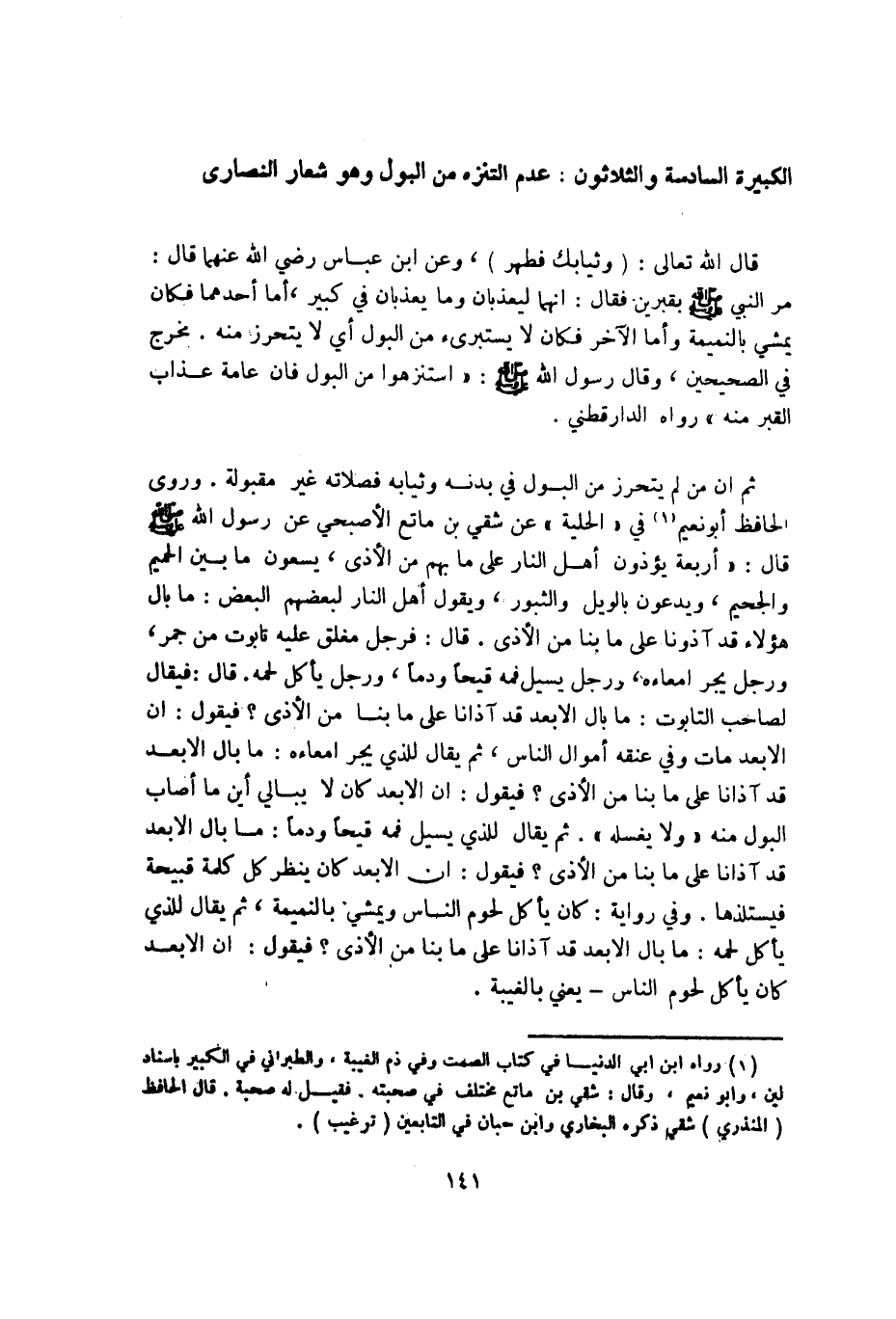 الْكَبِيرَة السَّادِسَة وَالثَّلَاثُونَ عدم التَّنَزُّه من الْبَوْل وَهُوَ شعار النَّصَارَى