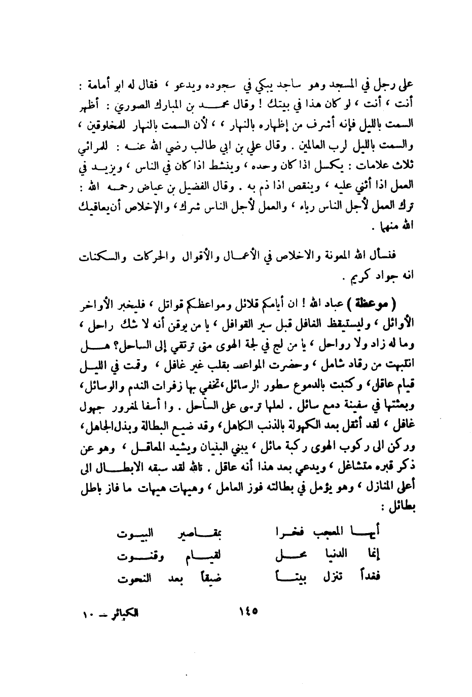 عباد الله إِن أيامكم قَلَائِل ومواعظكم قواتل فليخبر الْأَوَاخِر الْأَوَائِل وليستيقظ الغافل قبل سير القوافل يَا من يُوقن أَنه لَا شك راحل وَمَا لَهُ زَاد وَلَا رواحل يَا من لج فِي لجة الْهوى مَتى ترتقي إِلَى السَّاحِل هَل انْتَبَهت من رقاد شَامِل وَحَضَرت المواعظ بقلب غير غافل وَقمت فِي اللَّيْل قيام عَاقل وكتبت بالدموع سطور الرسائل تخفي بهَا زفرات النَّدَم والوسائل وبعثتها فِي سفينة دمع سَائل لَعَلَّهَا ترسي على السَّاحِل وأسفا لمغرور جهول غافل لقد أثقل بعد الكهولة بالذنب الْكَاهِل وَقد ضيع البطالة وبذل الْجَاهِل وركن إِلَى ركُوب الْهوى ركبة مائل يَبْنِي الْبُنيان ويشيد المعاقل وَهُوَ عَن ذكر قَبره متشاغل وَيَدعِي بعد هَذَا أَنه عَاقل تالله لقد سبقه الْأَبْطَال إِلَى أَعلَى الْمنَازل وَهُوَ يؤمل فِي بطالته فوز الْعَامِل وهيهات هَيْهَات مَا فَازَ بَاطِل بطائل