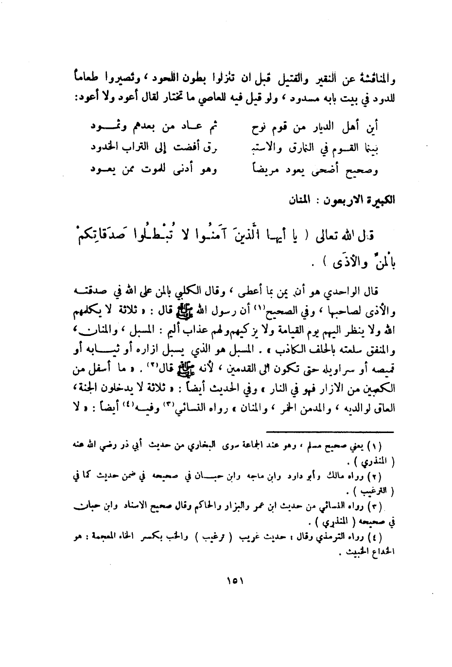 قَالَ الله تَعَالَى {يَا أَيهَا الَّذين آمنُوا لَا تُبْطِلُوا صَدقَاتكُمْ بالمن والأذى} قَالَ الواحدي هُوَ أَن يمن بِمَا أعْطى وَقَالَ الْكَلْبِيّ بالمن على الله فِي صدقته والأذى لصَاحِبهَا وَفِي الصَّحِيح أَن رَسُول الله صلى الله عَلَيْهِ وَسلم قَالَ ثَلَاثَة لَا يكلمهم الله وَلَا ينظر إِلَيْهِم يَوْم الْقِيَامَة وَلَا يزكيهم وَلَهُم عَذَاب أَلِيم المسبل والمنان والمنفق سلْعَته بِالْحلف الْكَاذِب المسبل هُوَ الَّذِي يسبل إزَاره أَو ثِيَابه أَو قَمِيصه أَو سراويله حَتَّى تكون إِلَى الْقَدَمَيْنِ لِأَنَّهُ صلى الله عَلَيْهِ وَسلم قَالَ مَا أَسْفَل من الْكَعْبَيْنِ من الْإِزَار فَهُوَ فِي النَّار وَفِي الحَدِيث أَيْضا ثَلَاثَة لَا يدْخلُونَ الْجنَّة الْعَاق لوَالِديهِ والمدمن الْخمر والمنان رَوَاهُ النَّسَائِيّ وَفِيه أَيْضا لَا