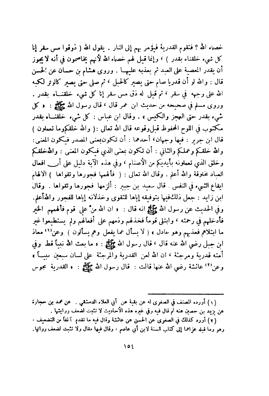 خصماء الله فتقوم الْقَدَرِيَّة فَيُؤْمَر بهم إِلَى النَّار يَقُول الله {ذوقوا مس سقر إِنَّا كل شَيْء خلقناه بِقدر} وَإِنَّمَا قيل لَهُم خصماء الله لأَنهم يُخَاصِمُونَ فِي أَنه لَا يجوز أَن يقدر الْمعْصِيَة على العَبْد ثمَّ يعذبه عَلَيْهَا وروى هِشَام بن حسان عَن الْحسن قَالَ وَالله لَو أَن قدرياً صَامَ حَتَّى يصير كالحبل ثمَّ صلى حَتَّى يصير كالوتر لكبه الله على وَجهه فِي سقر ثمَّ قيل لَهُ ذُقْ مس سقر إِنَّا كل شَيْء خلقناه بِقدر وروى مُسلم فِي صَحِيحه من حَدِيث ابْن عمر قَالَ قَالَ رَسُول الله صلى الله عَلَيْهِ وَسلم كل شَيْء بِقدر حَتَّى الْعَجز والكيس وَقَالَ ابْن عَبَّاس كل شَيْء خلقناه بِقدر مَكْتُوب فِي اللَّوْح الْمَحْفُوظ قبل وُقُوعه قَالَ الله تَعَالَى {وَالله خَلقكُم وَمَا تَعْمَلُونَ} قَالَ ابْن جرير فِيهَا وَجْهَان أَحدهمَا أَن تكون بِمَعْنى الْمصدر فَيكون الْمَعْنى وَالله خَلقكُم وعملكم وَالثَّانِي أَن تكون بِمَعْنى الَّذِي فَيكون الْمَعْنى وَالله خَلقكُم وَخلق الَّذِي تعملونه بِأَيْدِيكُمْ من الْأَصْنَام وَفِي هَذِه الْآيَة دَلِيل على أَن أَفعَال الْعباد مخلوقة وَالله أعلم وَقَالَ الله تَعَالَى {فألهمها فجورها وتقواها} الإلهام إِيقَاع الشَّيْء فِي النَّفس قَالَ سعيد بن جُبَير ألزمها فجورها وتقواها وَقَالَ ابْن زايد جعل ذَلِك فِيهَا بتوفيقه إِيَّاهَا للتقوى وخذلانه إِيَّاهَا للفجور وَالله أعلم وَفِي الحَدِيث عَن رَسُول الله صلى الله عَلَيْهِ وَسلم أَنه قَالَ إِن الله من على قوم فألهمهم الْخَيْر فأدخلهم فِي رَحمته وابتلى قوماً فخذلهم وذمهم على أفعالهم وَلم يستطيعوا غير مَا ابْتَلَاهُم فعذبهم وَهُوَ عَادل لَا يسْأَل عَمَّا يفعل وهم يسْأَلُون وَعَن معَاذ بن جبل رَضِي الله عَنهُ قَالَ قَالَ رَسُول الله صلى الله عَلَيْهِ وَسلم مَا بعث الله نَبيا قط وَفِي أمته قدرية ومرجئة إِن الله لعن الْقَدَرِيَّة والمرجئة على لِسَان سبعين نَبيا وَعَن عَائِشَة رَضِي الله عَنْهَا قَالَت قَالَ رَسُول الله صلى الله عَلَيْهِ وَسلم الْقَدَرِيَّة مجوس