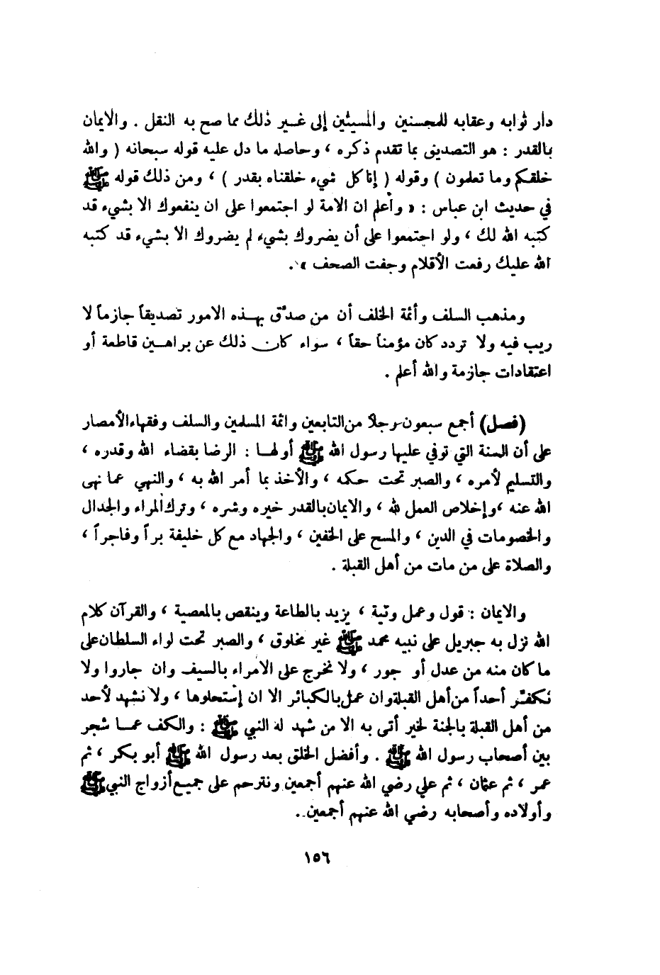 أجمع سَبْعُونَ رجلاً من التَّابِعين وأئمة الْمُسلمين وَالسَّلَف وفقهاء الْأَمْصَار على أَن السنة الَّتِي توفي عَلَيْهَا رَسُول الله صلى الله عَلَيْهِ وَسلم أَولهَا الرِّضَا بِقَضَاء الله وَقدره وَالتَّسْلِيم لأَمره وَالصَّبْر تَحت حكمه وَالْأَخْذ بِمَا أَمر الله بِهِ وَالنَّهْي عَمَّا نهى الله عَنهُ وإخلاص الْعَمَل لله وَالْإِيمَان بِالْقدرِ خَيره وشره وَترك المراء والجدال والخصومات فِي الدين وَالْمسح على الْخُفَّيْنِ وَالْجهَاد مَعَ كل خَليفَة براً وفاجراً وَالصَّلَاة على من مَاتَ من أهل الْقبْلَة وَالْإِيمَان قَول وَعمل وَنِيَّة يزِيد بِالطَّاعَةِ وَينْقص بالمعصية وَالْقُرْآن كَلَام الله نزل بِهِ جِبْرِيل على نبيه مُحَمَّد صلى الله عَلَيْهِ وَسلم غير مَخْلُوق وَالصَّبْر تَحت لِوَاء السُّلْطَان على مَا كَانَ مِنْهُ من عدل أَو جور وَلَا نخرج على الْأُمَرَاء بِالسَّيْفِ وَإِن جاروا وَلَا نكفر أحداً من أهل الْقبْلَة وَإِن عمل الْكَبَائِر إِلَّا إِن استحلوها وَلَا نشْهد لأحد من أهل الْقبْلَة بِالْجنَّةِ لخير أَتَى بِهِ إِلَّا من شهد لَهُ النَّبِي صلى الله عَلَيْهِ وَسلم والكف عَمَّا شجر بَين أَصْحَاب رَسُول الله صلى الله عَلَيْهِ وَسلم وَأفضل الْخلق بعد رَسُول الله صلى الله عَلَيْهِ وَسلم أَبُو بكر ثمَّ عمر ثمَّ عُثْمَان ثمَّ عَليّ رَضِي الله عَنْهُم أَجْمَعِينَ ونترحم على جَمِيع أَزوَاج النَّبِي صلى الله عَلَيْهِ وَسلم وَأَوْلَاده وَأَصْحَابه رَضِي الله عَنْهُم أَجْمَعِينَ
