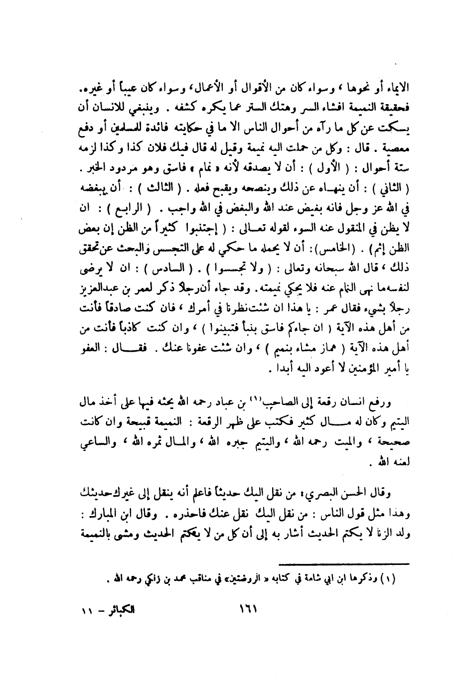 الْإِيمَاء أَو نَحْوهَا وَسَوَاء كَانَ من الْأَقْوَال أَو الْأَعْمَال وَسَوَاء كَانَ عَيْبا أَو غَيره فحقيقة النميمة إفشاء السِّرّ وهتك السّتْر عَمَّا يكره كشفه وَيَنْبَغِي للْإنْسَان أَن يسكت عَن كل مَا رَآهُ من أَحْوَال النَّاس إِلَّا مَا فِي حكايته فَائِدَة للْمُسلمين أَو دفع مَعْصِيّة قَالَ وكل من حملت إِلَيْهِ نميمة وَقيل لَهُ قَالَ فِيك فلَان كَذَا وَكَذَا لزمَه سِتَّة أَحْوَال (الأول) أَن لَا يصدقهُ لِأَنَّهُ نمام فَاسق وَهُوَ مَرْدُود الْخَبَر (الثَّانِي) أَن ينهاه عَن ذَلِك وينصحه ويقبح فعله (الثَّالِث) أَن يبغضه فِي الله عز وَجل فَإِنَّهُ بغيض عِنْد الله والبغض فِي الله وَاجِب (الرَّابِع) أَن لَا يظن فِي الْمَنْقُول عَنهُ السوء لقَوْله تَعَالَى {إجتنبوا كثيراً من الظَّن إِن بعض الظَّن إِثْم} الْخَامِس أَن لَا يحملهُ مَا حُكيَ لَهُ على التَّجَسُّس والبحث عَن تحقق ذَلِك قَالَ الله سُبْحَانَهُ وَتَعَالَى {وَلَا تجسسوا} السَّادِس أَن لَا يرضى لنَفسِهِ مَا نهى النمام عَنهُ فَلَا يَحْكِي نميمته وَقد جَاءَ أَن رجلاً ذكر لعمر بن عبد الْعَزِيز رجلاً بِشَيْء فَقَالَ عمر يَا هَذَا إِن شِئْت نَظرنَا فِي أَمرك فَإِن كنت صَادِقا فَأَنت من أهل هَذِه الْآيَة إِن جَاءَكُم فَاسق بنبأ فَتَبَيَّنُوا وَإِن كنت كَاذِبًا فَأَنت من أهل هَذِه الْآيَة هماز مشاء بنميم وَإِن شِئْت عَفَوْنَا عَنْك فَقَالَ الْعَفو يَا أَمِير الْمُؤمنِينَ لَا أَعُود إِلَيْهِ أبداً وَرفع إِنْسَان رقْعَة إِلَى الصاحب بن عباد رَحمَه الله يحثه فِيهَا على أَخذ مَال الْيَتِيم وَكَانَ لَهُ مَال كثير فَكتب على ظهر الرقعة النميمة قبيحة وَإِن كَانَت صَحِيحَة وَالْمَيِّت رَحمَه الله واليتيم جبره الله وَالْمَال ثمره الله والساعي لَعنه الله وَقَالَ الْحسن الْبَصْرِيّ من نقل إِلَيْك حَدِيثا فَاعْلَم أَنه ينْقل إِلَى غَيْرك حَدِيثك وَهَذَا مثل قَول النَّاس من نقل إِلَيْك نقل عَنْك فاحذره وَقَالَ ابْن الْمُبَارك ولد الزِّنَا لَا يكتم الحَدِيث أَشَارَ بِهِ إِلَى أَن كل من لَا يكتم الحَدِيث وَمَشى بالنميمة