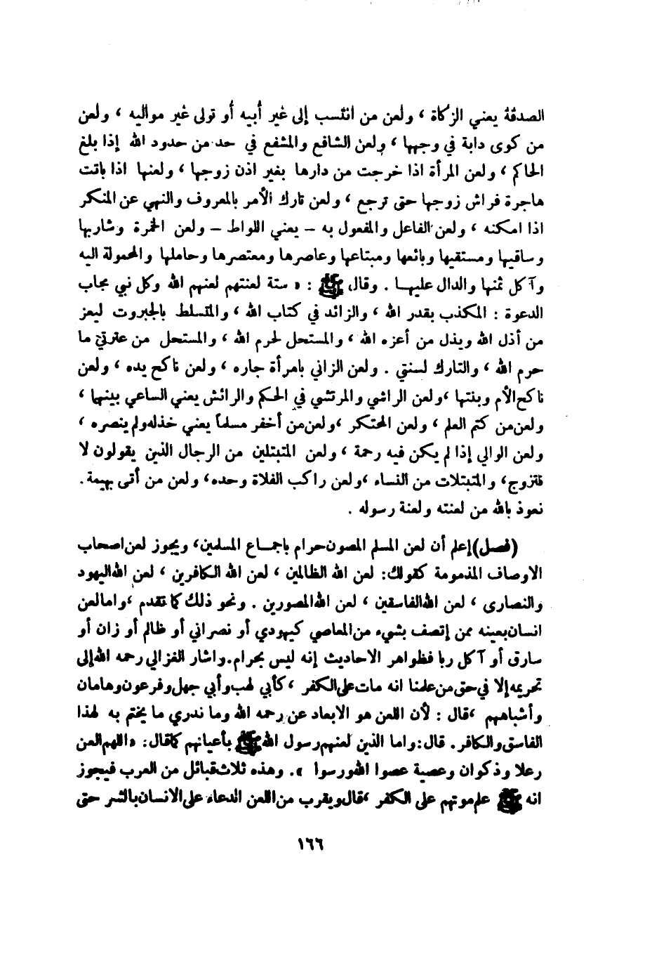 الصَّدَقَة يَعْنِي الزَّكَاة وَلعن من انتسب إِلَى غير أَبِيه أَو تولى غير موَالِيه وَلعن من كوى دَابَّة فِي وَجههَا وَلعن الشافع والمشفع فِي حد من حُدُود الله إِذا بلغ الْحَاكِم وَلعن الْمَرْأَة إِذا خرجت من دارها بِغَيْر إِذن زَوجهَا ولعنها إِذا باتت هاجرة فرَاش زَوجهَا حَتَّى ترجع وَلعن تَارِك الْأَمر بِالْمَعْرُوفِ وَالنَّهْي عَن الْمُنكر إِذا أمكنه وَلعن الْفَاعِل وَالْمَفْعُول بِهِ يَعْنِي اللواط وَلعن الْخمْرَة وشاربها وساقيها ومستقيها وبائعها ومبتاعها عاصرها ومعتصرها وحاملها والمحمولة إِلَيْهِ وآكل ثمنهَا وَالدَّال عَلَيْهَا وَقَالَ صلى الله عَلَيْهِ وَسلم سِتَّة لعنتهم لعنهم الله وكل نَبِي مجاب الدعْوَة المكذب بِقدر الله وَالزَّائِد فِي كتاب الله والمتسلط بالجبروت ليعز من أذل الله ويذل من أعزه الله والمستحل لحرم الله والمستحل من عِتْرَتِي مَا حرم الله والتارك لسنتي وَلعن الزَّانِي بِامْرَأَة جَاره وَلعن ناكح يَده وَلعن ناكح الْأُم وبنتها وَلعن الراشي والمرتشي فِي الحكم والرائش يَعْنِي السَّاعِي بَينهمَا وَلعن من كتم الْعلم وَلعن المحتكر وَلعن من أَخْفَر مُسلما يَعْنِي خذله وَلم ينصره وَلعن الْوَالِي إِذا لم يكن فِيهِ رَحْمَة وَلعن المتبتلين من الرِّجَال الَّذين يَقُولُونَ لَا نتزوج والمتبتلات من النِّسَاء وَلعن رَاكب الفلاة وَحده وَلعن من أَتَى بَهِيمَة نَعُوذ بِاللَّه من لعنته ولعنة رَسُوله