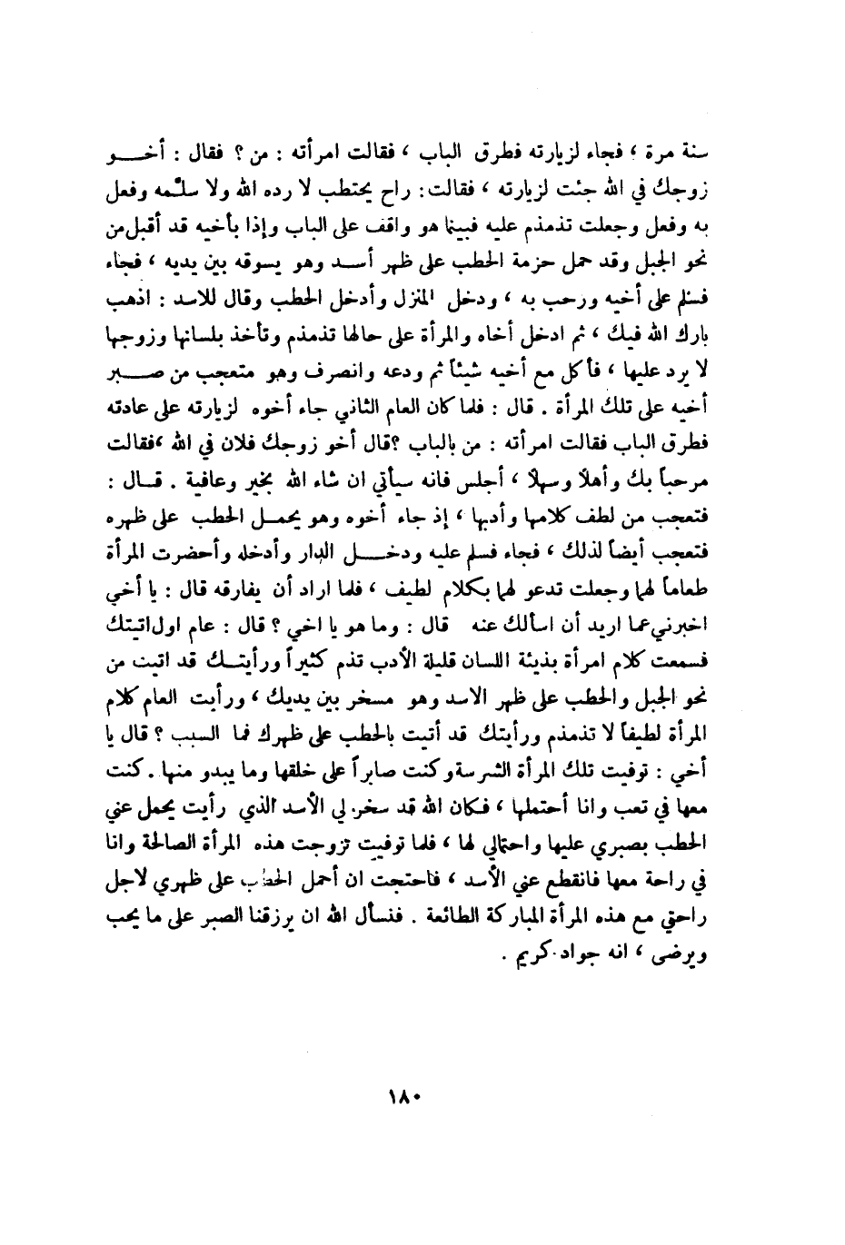 سنة مرة فجَاء لزيارته فطرق الْبَاب فَقَالَت امْرَأَته من فَقَالَ أَخُو زَوجك فِي الله جِئْت لزيارته فَقَالَت رَاح يحتطب لَا رده الله وَلَا سلمه وَفعل بِهِ وَفعل وَجعلت تذمذم عَلَيْهِ فَبَيْنَمَا هُوَ وَاقِف على الْبَاب وَإِذا بأَخيه قد أقبل من نَحْو الْجَبَل وَقد حمل حزمة الْحَطب على ظهر أَسد وَهُوَ يَسُوقهُ بَين يَدَيْهِ فجَاء فَسلم على أَخِيه ورحب بِهِ وَدخل الْمنزل وَأدْخل الْحَطب وَقَالَ للأسد اذْهَبْ بَارك الله فِيك ثمَّ أَدخل أَخَاهُ وَالْمَرْأَة على حَالهَا تذمذم وَتَأْخُذ بلسانها وَزوجهَا لَا يرد عَلَيْهَا فَأكل مَعَ أَخِيه شَيْئا ثمَّ ودعه وَانْصَرف وَهُوَ متعجب من صَبر أَخِيه على تِلْكَ الْمَرْأَة قَالَ فَلَمَّا كَانَ الْعَام الثَّانِي جَاءَ أَخُوهُ لزيارته على عَادَته فطرق الْبَاب فَقَالَت امْرَأَته من بِالْبَابِ قَالَ أَخُو زَوجك فلَان فِي الله فَقَالَت مرْحَبًا بك وَأهلا وسهلاً اجْلِسْ فَإِنَّهُ سَيَأْتِي إِن شَاءَ الله بِخَير وعافية قَالَ فتعجب من لطف كَلَامهَا وأدبها إِذْ جَاءَ أَخُوهُ وَهُوَ يحمل الْحَطب على ظَهره فتعجب أَيْضا لذَلِك فجَاء فَسلم عَلَيْهِ وَدخل الدَّار وَأدْخلهُ وأحضرت الْمَرْأَة طَعَاما لَهما وَجعلت تَدْعُو لَهما بِكَلَام لطيف فَلَمَّا أَرَادَ أَن يُفَارِقهُ قَالَ يَا أخي أَخْبرنِي عَمَّا أُرِيد أَن أَسأَلك عَنهُ قَالَ وَمَا هُوَ يَا أخي قَالَ عَام أول أَتَيْتُك فَسمِعت كَلَام امْرَأَة بذيئة اللِّسَان قَليلَة الْأَدَب تذم كثيراً ورأيتك قد أتيت من نَحْو الْجَبَل والحطب على ظهر الْأسد وَهُوَ مسخر بَين يَديك وَرَأَيْت الْعَام كَلَام الْمَرْأَة لطيفاً لَا تذمذم ورأيتك قد أتيت بالحطب على ظهرك فَمَا السَّبَب قَالَ يَا أخي توفيت تِلْكَ الْمَرْأَة الشرسة وَكنت صَابِرًا على خلقهَا وَمَا يَبْدُو مِنْهَا كنت مَعهَا فِي تَعب وَأَنا أحتملها فَكَانَ الله قد سخر لي الْأسد الَّذِي رَأَيْت يحمل عني الْحَطب بصبري عَلَيْهَا واحتمالي لَهَا فَلَمَّا توفيت تزوجت هَذِه الْمَرْأَة الصَّالِحَة وَأَنا فِي رَاحَة مَعهَا فَانْقَطع عني الْأسد فَاحْتَجت أَن أحمل الْحَطب على ظَهْري لأجل راحتي مَعَ هَذِه الْمَرْأَة الْمُبَارَكَة الطائعة فنسأل الله أَن يرزقنا الصَّبْر على مَا يحب ويرضى إِنَّه جواد كريم