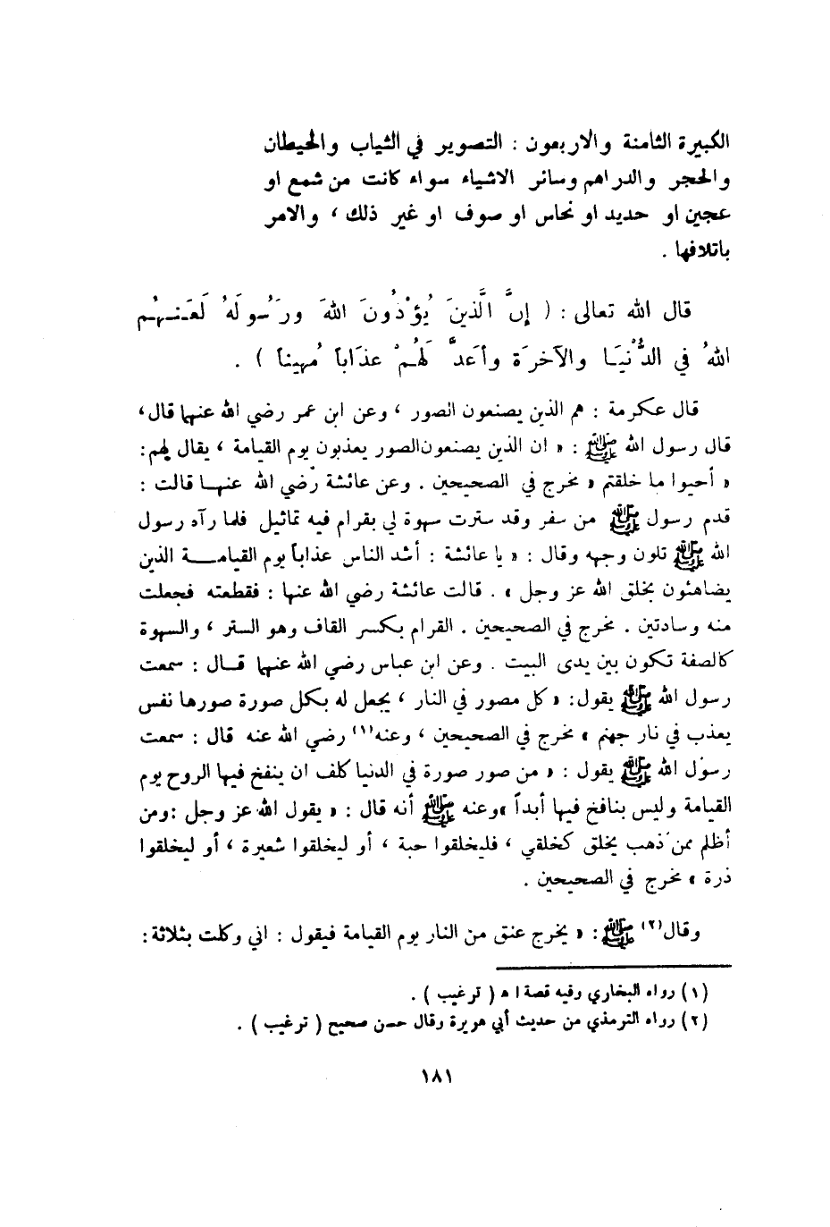 قَالَ الله تَعَالَى {إِن الَّذين يُؤْذونَ الله وَرَسُوله لعنهم الله فِي الدُّنْيَا وَالْآخِرَة وَأعد لَهُم عذَابا مهيناً} قَالَ عِكْرِمَة هم الَّذين يصنعون الصُّور وَعَن ابْن عمر رَضِي الله عَنْهُمَا قَالَ قَالَ رَسُول الله صلى الله عَلَيْهِ وَسلم إِن الَّذين يصنعون الصُّور يُعَذبُونَ يَوْم الْقِيَامَة يُقَال لَهُم أحيوا مَا خلقْتُمْ مخرج فِي الصَّحِيحَيْنِ وَعَن عَائِشَة رَضِي الله عَنْهَا قَالَت قدم رَسُول الله صلى الله عَلَيْهِ وَسلم من سفر وَقد سترت سهوة لي بقرام فِيهِ تماثيل فَلَمَّا رَآهُ رَسُول الله صلى الله عَلَيْهِ وَسلم تلون وَجهه وَقَالَ يَا عَائِشَة أَشد النَّاس عذَابا يَوْم الْقِيَامَة الَّذين يضاهئون بِخلق الله عز وَجل قَالَت عَائِشَة رَضِي الله عَنْهَا فقطعته فَجعلت مِنْهُ وسادتين مخرج فِي الصَّحِيحَيْنِ القرام بِكَسْر الْقَاف وَهُوَ السّتْر والسهوة كالصفة تكون بَين يَدي الْبَيْت وَعَن ابْن عَبَّاس رَضِي الله عَنْهُمَا قَالَ سَمِعت رَسُول الله صلى الله عَلَيْهِ وَسلم يَقُول كل مُصَور فِي النَّار يَجْعَل لَهُ بِكُل صُورَة صورها نفس يعذب فِي نَار جَهَنَّم مخرج فِي الصَّحِيحَيْنِ وَعنهُ رَضِي الله عَنهُ قَالَ سَمِعت رَسُول الله صلى الله عَلَيْهِ وَسلم يَقُول من صور صُورَة فِي الدُّنْيَا كلف أَن ينْفخ فِيهَا الروح يَوْم الْقِيَامَة وَلَيْسَ بنافخ فِيهَا أبداً وَعنهُ صلى الله عَلَيْهِ وَسلم أَنه قَالَ يَقُول الله عز وَجل وَمن أظلم مِمَّن ذهب يخلق كخلقي فليخلقوا حَبَّة أَو ليخلقوا شعيرَة أَو ليخلقوا ذرة مخرج فِي الصَّحِيحَيْنِ وَقَالَ صلى الله عَلَيْهِ وَسلم يخرج عنق من النَّار يَوْم الْقِيَامَة فَيَقُول إِنِّي وكلت بِثَلَاثَة