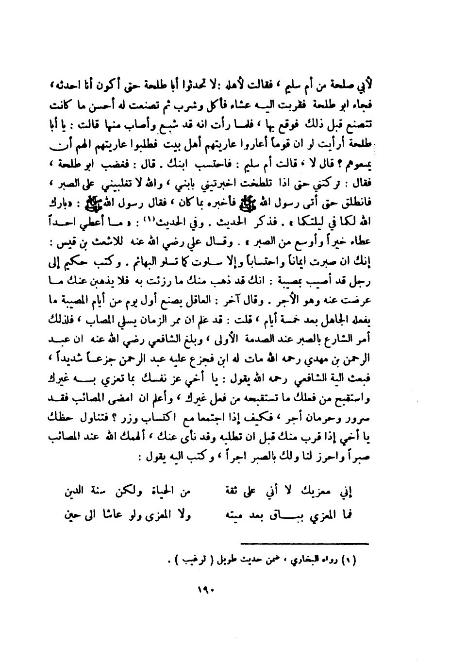 لأبي طَلْحَة من أم سليم فَقَالَت لأَهله لَا تحدثُوا أَبَا طَلْحَة حَتَّى أكون أَنا أحدثه فجَاء أَبُو طَلْحَة فقربت إِلَيْهِ عشَاء فَأكل وَشرب ثمَّ تصنعت لَهُ أحسن مَا كَانَت تتصنع قبل ذَلِك فَوَقع بهَا فَلَمَّا رَأَتْ أَنه قد شبع وَأصَاب مِنْهَا قَالَت يَا أَبَا طَلْحَة أَرَأَيْت لَو أَن قوماً أعاروا عاريتهم أهل بَيت فطلبوا عاريتهم ألهم أَن يمنعوهم قَالَ لَا قَالَت أم سليم فاحتسب ابْنك قَالَ فَغَضب أَبُو طَلْحَة فَقَالَ تَرَكتنِي حَتَّى إِذا تلطخت أخبرتيني بِابْني وَالله لَا تغلبيني على الصَّبْر فَانْطَلق حَتَّى أَتَى رَسُول الله صلى الله عَلَيْهِ وَسلم فأخبره بِمَا كَانَ فَقَالَ رَسُول الله صلى الله عَلَيْهِ وَسلم بَارك الله لَكمَا فِي ليلتكما فَذكر الحَدِيث وَفِي الحَدِيث مَا أعطي أحد عَطاء خيراً وأوسع من الصَّبْر وَقَالَ عَليّ رَضِي الله عَنهُ للأشعث بن قيس إِنَّك إِن صبرت إِيمَانًا واحتساباً وَإِلَّا سلوت كَمَا تسلو الْبَهَائِم وَكتب حَكِيم إِلَى رجل قد أُصِيب بمصيبة إِنَّك قد ذهب مِنْك مَا رزئت بِهِ فَلَا يذْهبن عَنْك مَا عرضت عَنهُ وَهُوَ الْأجر وَقَالَ آخر الْعَاقِل يصنع أول يَوْم من أَيَّام الْمُصِيبَة مَا يَفْعَله الْجَاهِل بعد خَمْسَة أَيَّام قلت قد علم أَن ممر الزَّمَان يسلي الْمُصَاب فَلذَلِك أَمر الشَّارِع بِالصبرِ عِنْد الصدمة الأولى وَبلغ الشَّافِعِي رَضِي الله عَنهُ أَن عبد الرَّحْمَن بن مهْدي رَحمَه الله مَاتَ لَهُ ابْن فجزع عَلَيْهِ عبد الرَّحْمَن جزعاً شَدِيدا فَبعث إِلَيْهِ الشَّافِعِي رَحمَه الله يَقُول يَا أخي عز نَفسك بِمَا تعزي بِهِ غَيْرك واستقبح من فعلك مَا تستقبحه من فعل غَيْرك وَاعْلَم أَن أمضى المصائب فقد سرُور وحرمان أجر فَكيف إِذا اجْتمعَا مَعَ اكْتِسَاب وزر فَتَنَاول حظك يَا أخي إِذا قرب مِنْك قبل أَن تطلبه وَقد نأى عَنْك ألهمك الله عِنْد المصائب صبراً وأحرز لنا وَلَك بِالصبرِ أجراً وَكتب إِلَيْهِ يَقُول
