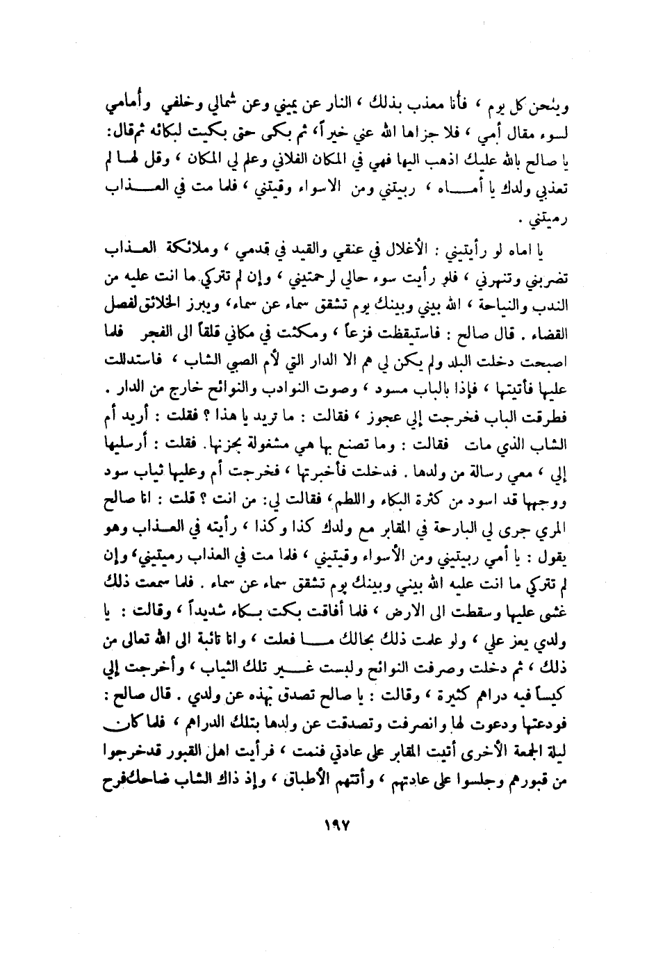 وينحن كل يَوْم فَأَنا معذب بذلك النَّار عَن يَمِيني وَعَن شمَالي وَخَلْفِي وأمامي لسوء مقَال أُمِّي فَلَا جزاها الله عني خيراً ثمَّ بكى حَتَّى بَكَيْت لبكائه ثمَّ قَالَ يَا صَالح بِاللَّه عَلَيْك اذْهَبْ إِلَيْهَا فَهِيَ فِي الْمَكَان الْفُلَانِيّ وَعلم لي الْمَكَان وَقل لَهَا لم تعذبي ولدك يَا أُمَّاهُ ربيتني وَمن الأسواء وقيتني فَلَمَّا مت فِي الْعَذَاب رميتني يَا أُمَّاهُ لَو رأيتيني الأغلال فِي عنقِي والقيد فِي قدمي وملائكة الْعَذَاب تضربني وتنهرني فَلَو رَأَيْت سوء حَالي لرحمتيني وَإِن لم تتركي مَا أَنْت عَلَيْهِ من الندب والنياحة الله بيني وَبَيْنك يَوْم تشقق سَمَاء عَن سَمَاء ويبرز الْخَلَائق لفصل الْقَضَاء قَالَ صَالح فَاسْتَيْقَظت فَزعًا وَمَكَثت فِي مَكَاني قلقاً إِلَى الْفجْر فَلَمَّا أَصبَحت دخلت الْبَلَد وَلم يكن لي هم إِلَّا الدَّار الَّتِي لأم الصَّبِي الشَّاب فاستدللت عَلَيْهَا فأتيتها فَإِذا بِالْبَابِ مسود وَصَوت النوادب والنوائح خَارج من الدَّار فطرقت الْبَاب فَخرجت إِلَيّ عَجُوز فَقَالَت مَا تُرِيدُ يَا هَذَا فَقلت أُرِيد أم الشَّاب الَّذِي مَاتَ فَقَالَت وَمَا تصنع بهَا هِيَ مَشْغُولَة بحزنها فَقلت أرسليها إِلَيّ معي رِسَالَة من وَلَدهَا فَدخلت فَأَخْبَرتهَا فَخرجت أم وَعَلَيْهَا ثِيَاب سود ووجهها قد اسود من كَثْرَة الْبكاء واللطم فَقَالَت لي من أَنْت قلت أَنا صَالح المري جرى لي البارحة فِي الْمَقَابِر مَعَ ولدك كَذَا وَكَذَا رَأَيْته فِي الْعَذَاب وَهُوَ يَقُول يَا أُمِّي ربيتيني وَمن الأسواء وقيتيني فَلَمَّا مت فِي الْعَذَاب رميتيني وَإِن لم تتركي مَا أَنْت عَلَيْهِ الله بيني وَبَيْنك يَوْم تشقق سَمَاء عَن سَمَاء فَلَمَّا سَمِعت ذَلِك غشي عَلَيْهَا وَسَقَطت إِلَى الأَرْض فَلَمَّا أفاقت بَكت بكاء شَدِيدا وَقَالَت يَا وَلَدي يعز عَليّ وَلَو علمت ذَلِك بحالك مَا فعلت وَأَنا تائبة إِلَى الله تَعَالَى من ذَلِك ثمَّ دخلت وصرفت النوائح ولبست غير تِلْكَ الثِّيَاب وأخرجت إِلَيّ كيساً فِيهِ دَرَاهِم كَثِيرَة وَقَالَت يَا صَالح تصدق بِهَذِهِ عَن وَلَدي قَالَ صَالح فودعتها ودعوت لَهَا وانصرفت وتصدقت عَن وَلَدهَا بِتِلْكَ الدَّرَاهِم فَلَمَّا كَانَ لَيْلَة الْجُمُعَة الْأُخْرَى أتيت الْمَقَابِر على عادتي فَنمت فَرَأَيْت أهل الْقُبُور قد خَرجُوا من قُبُورهم وجلسوا على عَادَتهم وأتتهم الأطباق وَإِذ ذَاك الشَّاب ضَاحِك فَرح