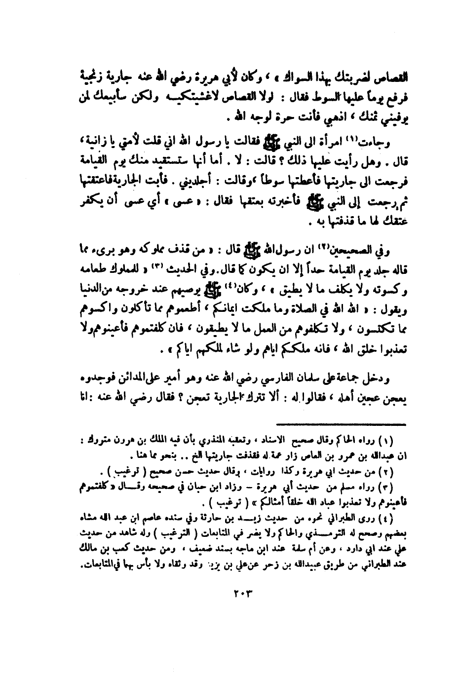 الْقصاص لضربتك بِهَذَا السِّوَاك وَكَانَ لأبي هُرَيْرَة رَضِي الله عَنهُ جَارِيَة زنجية فَرفع يَوْمًا عَلَيْهَا السَّوْط فَقَالَ لَوْلَا الْقصاص لأغشيتكيه وَلَكِن سأبيعك لمن يوفيني ثمنك اذهبي فَأَنت حرَّة لوجه الله وَجَاءَت امْرَأَة إِلَى النَّبِي صلى الله عَلَيْهِ وَسلم فَقَالَت يَا رَسُول الله إِنِّي قلت لأمتي يَا زَانِيَة قَالَ وَهل رَأَيْت عَلَيْهَا ذَلِك قَالَت لَا أما أَنَّهَا ستستقيد مِنْك يَوْم الْقِيَامَة فَرَجَعت إِلَى جاريتها فأعطتها سَوْطًا وَقَالَت اجلديني فَأَبت الْجَارِيَة فأعتقتها ثمَّ رجعت إِلَى النَّبِي صلى الله عَلَيْهِ وَسلم فَأَخْبَرته بِعتْقِهَا فَقَالَ عَسى أَي عَسى أَن يكفر عتقك لَهَا مَا قذفتها بِهِ وَفِي الصَّحِيحَيْنِ أَن رَسُول الله صلى الله عَلَيْهِ وَسلم قَالَ من قذف مَمْلُوكه وَهُوَ بَرِيء مِمَّا قَالَه جلد يَوْم الْقِيَامَة حدا إِلَّا أَن يكون كَمَا قَالَ وَفِي الحَدِيث للمملوك طَعَامه وَكسوته وَلَا يُكَلف مَا لَا يُطيق وَكَانَ صلى الله عَلَيْهِ وَسلم يوصيهم عِنْد خُرُوجه من الدُّنْيَا وَيَقُول الله الله فِي الصَّلَاة وَمَا ملكت أَيْمَانكُم أطعموهم مِمَّا تَأْكُلُونَ وَاكْسُوهُمْ مِمَّا تكتسون وَلَا تُكَلِّفُوهُمْ من الْعَمَل مَا لَا يُطِيقُونَ فَإِن كلفْتُمُوهُمْ فَأَعِينُوهُمْ وَلَا تعذبوا خلق الله فَإِنَّهُ ملككم إيَّاهُم وَلَو شَاءَ لملكهم إيَّاكُمْ وَدخل جمَاعَة على سلمَان الْفَارِسِي رَضِي الله عَنهُ وَهُوَ أَمِير على الْمَدَائِن فوجدوه يعجن عجين أَهله فَقَالُوا لَهُ أَلا تتْرك الْجَارِيَة تعجن فَقَالَ رَضِي الله عَنهُ إِنَّا