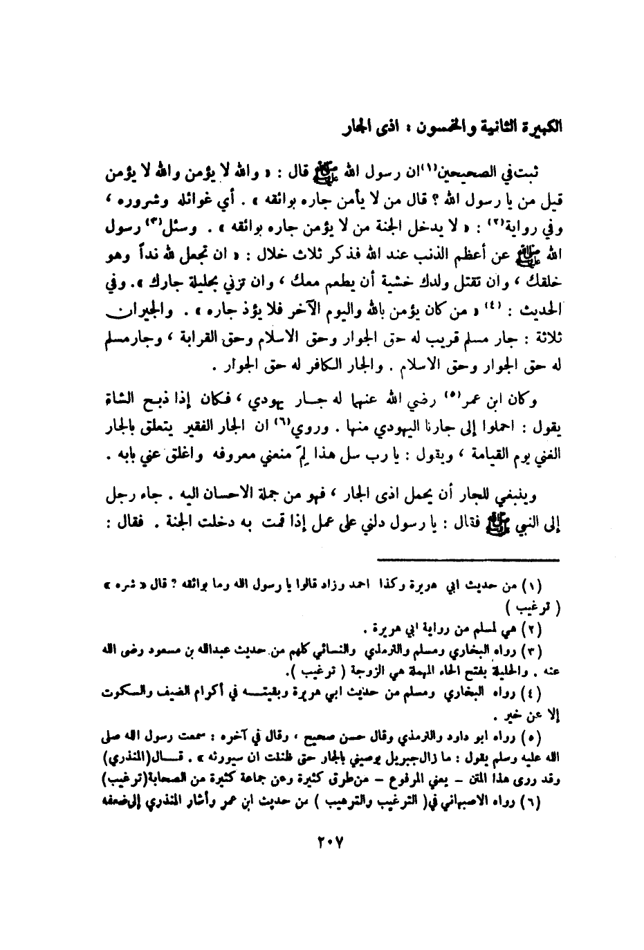 ثَبت فِي الصَّحِيحَيْنِ أَن رَسُول الله صلى الله عَلَيْهِ وَسلم قَالَ وَالله لَا يُؤمن وَالله لَا يُؤمن قيل من يَا رَسُول الله قَالَ من لَا يَأْمَن جَاره بوائقه أَي غوائله وشروره وَفِي رِوَايَة لَا يدْخل الْجنَّة من لَا يُؤمن جَاره بوائقه وَسُئِلَ رَسُول الله صلى الله عَلَيْهِ وَسلم عَن أعظم الذَّنب عِنْد الله فَذكر ثَلَاث خلال أَن تجْعَل لله نداً وَهُوَ خلقك وَأَن تقتل ولدك خشيَة أَن يطعم مَعَك وَأَن تَزني بحليلة جَارك وَفِي الحَدِيث من كَانَ يُؤمن بِاللَّه وَالْيَوْم الآخر فَلَا يؤذ جَاره وَالْجِيرَان ثَلَاثَة جَار مُسلم قريب لَهُ حق الْجوَار وَحقّ الْإِسْلَام وَحقّ الْقَرَابَة وجار مُسلم لَهُ حق الْجوَار وَحقّ الْإِسْلَام وَالْجَار الْكَافِر لَهُ حق الْجوَار وَكَانَ ابْن عمر رَضِي الله عَنْهُمَا لَهُ جَار يَهُودِيّ فَكَانَ إِذا ذبح الشَّاة يَقُول احملوا إِلَى جارنا الْيَهُودِيّ مِنْهَا وَرُوِيَ أَن الْجَار الْفَقِير يتَعَلَّق بالجار الْغَنِيّ يَوْم الْقِيَامَة وَيَقُول يَا رب سل هَذَا لم مَنَعَنِي معروفه وأغلق عني بَابه وَيَنْبَغِي للْجَار أَن يحمل أَذَى الْجَار فَهُوَ من جملَة الْإِحْسَان إِلَيْهِ جَاءَ رجل إِلَى النَّبِي صلى الله عَلَيْهِ وَسلم فَقَالَ يَا رَسُول دلَّنِي على عمل إِذا قُمْت بِهِ دخلت الْجنَّة فَقَالَ
