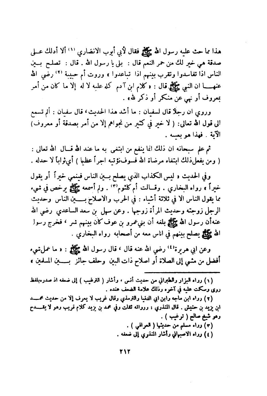 هَذَا مِمَّا حث عَلَيْهِ رَسُول الله صلى الله عَلَيْهِ وَسلم فَقَالَ لأبي أَيُّوب الْأنْصَارِيّ أَلا أدلك على صَدَقَة هِيَ خير لَك من حمر النعم قَالَ بلَى يَا رَسُول الله قَالَ تصلح بَين النَّاس إِذا تفاسدوا وتقرب بَينهم إِذا تباعدوا وروت أم حَبِيبَة رَضِي الله عَنْهَا إِن النَّبِي صلى الله عَلَيْهِ وَسلم قَالَ كَلَام ابْن آدم كُله عَلَيْهِ لَا لَهُ إِلَّا مَا كَانَ من أَمر بِمَعْرُوف أَو نهي عَن مُنكر أَو ذكر لله وَرُوِيَ أَن رجلاً قَالَ لِسُفْيَان مَا أَشد هَذَا الحَدِيث قَالَ سُفْيَان ألم تسمع إِلَى قَول الله تَعَالَى {لَا خير فِي كثير من نَجوَاهُمْ إِلَّا من أَمر بِصَدقَة أَو مَعْرُوف} الْآيَة فَهَذَا هُوَ بِعَيْنِه ثمَّ علم سُبْحَانَهُ أَن ذَلِك إِنَّمَا ينفع من ابْتغى بِهِ مَا عِنْد الله قَالَ الله تَعَالَى {وَمن يفعل ذَلِك ابْتِغَاء مرضات الله فَسَوف نؤتيه أجراً عَظِيما} أَي ثَوابًا لَا حد لَهُ وَفِي الحَدِيث لَيْسَ الْكذَّاب الَّذِي يصلح بَين النَّاس فينمي خيراً أَو يَقُول خيراً رَوَاهُ البُخَارِيّ وَقَالَت أم كُلْثُوم وَلم أسمعهُ صلى الله عَلَيْهِ وَسلم يرخص فِي شَيْء مِمَّا يَقُول النَّاس إِلَّا فِي ثَلَاثَة أَشْيَاء فِي الْحَرْب والإصلاح بَين النَّاس وَحَدِيث الرجل زَوجته وَحَدِيث الْمَرْأَة زَوجهَا وَعَن سهل بن سعد السَّاعِدِيّ رَضِي الله عَنهُ أَن رَسُول الله صلى الله عَلَيْهِ وَسلم بلغه أَن بني عَمْرو بن عَوْف كَانَ بَينهم شَرّ فَخرج رَسُول الله صلى الله عَلَيْهِ وَسلم يصلح بَينهم فِي أنَاس مَعَه من أَصْحَابه رَوَاهُ البُخَارِيّ وَعَن أبي هُرَيْرَة رَضِي الله عَنهُ قَالَ قَالَ رَسُول الله صلى الله عَلَيْهِ وَسلم مَا عمل شَيْء أفضل من مشي إِلَى الصَّلَاة أَو إصْلَاح ذَات الْبَين وَحلف جَائِز بَين الْمُسلمين