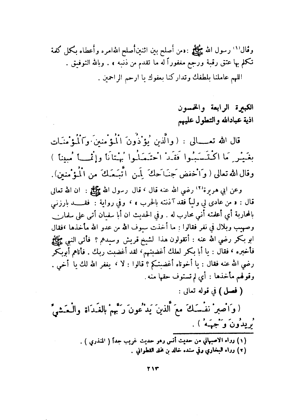 قَالَ الله تَعَالَى {وَالَّذين يُؤْذونَ الْمُؤمنِينَ وَالْمُؤْمِنَات بِغَيْر مَا اكتسبوا فقد احتملوا بهتاناً وإثما مُبينًا} وَقَالَ الله تَعَالَى {واخفض جناحك لمن اتبعك من الْمُؤمنِينَ} وَعَن أبي هُرَيْرَة رَضِي الله عَنهُ قَالَ قَالَ رَسُول الله صلى الله عَلَيْهِ وَسلم إِن الله تَعَالَى قَالَ من عادى لي ولياً فقد آذنته بِالْحَرْبِ وَفِي رِوَايَة فقد بارزني بالمحاربة أَي أعلمته أَنِّي محَارب لَهُ وَفِي الحَدِيث أَن أَبَا سُفْيَان أَتَى على سلمَان وصهيب وبلال فِي نفر فَقَالُوا مَا أخذت سيوف الله من عَدو الله مأخذها فَقَالَ أَبُو بكر رَضِي الله عَنهُ أتقولون هَذَا لشيخ قُرَيْش وسيدهم فَأتى النَّبِي صلى الله عَلَيْهِ وَسلم فَأخْبرهُ فَقَالَ يَا أَبَا بكر لَعَلَّك أغضبتهم لقد أغضبت رَبك فَأَتَاهُم أَبُو بكر رَضِي الله عَنهُ فَقَالَ يَا أخوتاه أغضبتكم قَالُوا لَا يغْفر الله لَك يَا أخي وَقَوْلهمْ مأخذها أَي لم تستوف حَقّهَا مِنْهُ