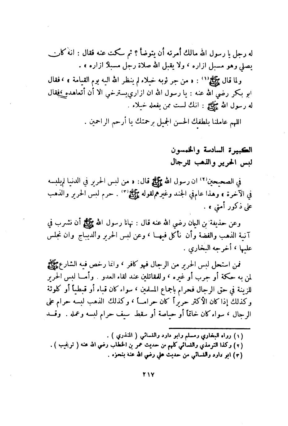 لَهُ رجل يَا رَسُول الله مَالك أَمرته أَن يتَوَضَّأ ثمَّ سكت عَنهُ فَقَالَ إِنَّه كَانَ يُصَلِّي وَهُوَ مُسبل إزَاره وَلَا يقبل الله صَلَاة رجل مسبلاً إزَاره وَلما قَالَ صلى الله عَلَيْهِ وَسلم من جر ثَوْبه خُيَلَاء لم ينظر الله إِلَيْهِ يَوْم الْقِيَامَة فَقَالَ أَبُو بكر رَضِي الله عَنهُ يَا رَسُول الله إِن إزَارِي يسترخي إِلَّا أَن أتعاهده فَقَالَ لَهُ رَسُول الله صلى الله عَلَيْهِ وَسلم إِنَّك لست مِمَّن يَفْعَله خُيَلَاء اللَّهُمَّ عاملنا بلطفك الْحسن الْجَمِيل بِرَحْمَتك يَا أرْحم الرَّاحِمِينَ