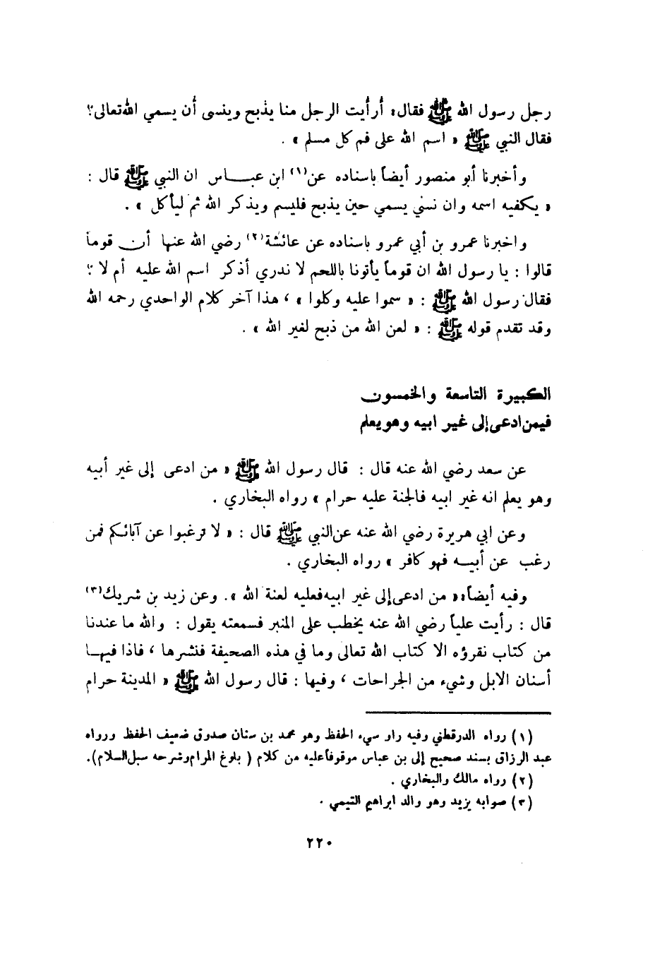عَن سعد رَضِي الله عَنهُ قَالَ قَالَ رَسُول الله صلى الله عَلَيْهِ وَسلم من ادعى إِلَى غير أَبِيه وَهُوَ يعلم أَنه غير أَبِيه فالجنة عَلَيْهِ حرَام رَوَاهُ البُخَارِيّ وَعَن أبي هُرَيْرَة رَضِي الله عَنهُ عَن النَّبِي صلى الله عَلَيْهِ وَسلم قَالَ لَا ترغبوا عَن آبائكم فَمن رغب عَن أَبِيه فَهُوَ كَافِر رَوَاهُ البُخَارِيّ وَفِيه أَيْضا من ادعى إِلَى غير أَبِيه فَعَلَيهِ لعنة الله وَعَن زيد بن شريك قَالَ رَأَيْت علياً رَضِي الله عَنهُ يخْطب على الْمِنْبَر فَسَمعته يَقُول وَالله مَا عندنَا من كتاب نقرؤه إِلَّا كتاب الله تَعَالَى وَمَا فِي هَذِه الصَّحِيفَة فنشرها فَإِذا فِيهَا أَسْنَان الْإِبِل وَشَيْء من الْجِرَاحَات وفيهَا قَالَ رَسُول الله صلى الله عَلَيْهِ وَسلم الْمَدِينَة حرَام