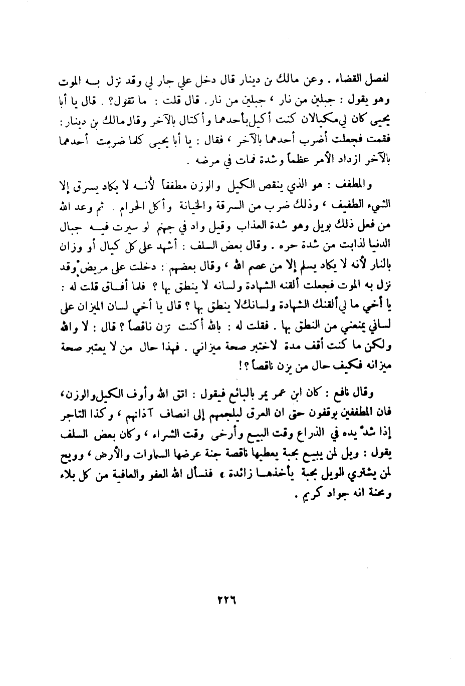 لفصل الْقَضَاء وَعَن مَالك بن دِينَار قَالَ دخل عَليّ جَار لي وَقد نزل بِهِ الْمَوْت وَهُوَ يَقُول جبلين من نَار جبلين من نَار قَالَ قلت مَا تَقول قَالَ يَا أَبَا يحيى كَانَ لي مكيالان كنت أكيل بِأَحَدِهِمَا وأكتال بِالْآخرِ وَقَالَ مَالك بن دِينَار فَقُمْت فَجعلت أضْرب أَحدهمَا بِالْآخرِ فَقَالَ يَا أَبَا يحيى كلما ضربت أَحدهمَا بِالْآخرِ ازْدَادَ الْأَمر عظماً وَشدَّة فَمَاتَ فِي مَرضه والمطفف هُوَ الَّذِي ينقص الْكَيْل وَالْوَزْن مطففاً لِأَنَّهُ لَا يكَاد يسرق إِلَّا الشَّيْء الطفيف وَذَلِكَ ضرب من السّرقَة والخيانة وَأكل الْحَرَام ثمَّ وعد الله من فعل ذَلِك بويل وَهُوَ شدَّة الْعَذَاب وَقيل وَاد فِي جَهَنَّم لَو سيرت فِيهِ جبال الدُّنْيَا لذابت من شدَّة حره وَقَالَ بعض السلف أشهد على كل كيال أَو وزان بالنَّار لِأَنَّهُ لَا يكَاد يسلم إِلَّا من عصم الله وَقَالَ بَعضهم دخلت على مَرِيض وَقد نزل بِهِ الْمَوْت فَجعلت ألقنه الشَّهَادَة وَلسَانه لَا ينْطق بهَا فَلَمَّا أَفَاق قلت لَهُ يَا أخي مَالِي ألقنك الشَّهَادَة وَلِسَانك لَا ينْطق بهَا قَالَ يَا أخي لِسَان الْمِيزَان على لساني يَمْنعنِي من النُّطْق بهَا فَقلت لَهُ بِاللَّه أَكنت تزن نَاقِصا قَالَ لَا وَالله وَلَكِن مَا كنت أَقف مُدَّة لأختبر صِحَة ميزاني فَهَذَا حَال من لَا يعْتَبر صِحَة مِيزَانه فَكيف حَال من يزن نَاقِصا وَقَالَ نَافِع كَانَ ابْن عمر يمر بالبائع فَيَقُول اتَّقِ الله وأوف الْكَيْل وَالْوَزْن فَإِن المطففين يوقفون حَتَّى أَن الْعرق ليلجمهم إِلَى أَنْصَاف آذانهم وَكَذَا التَّاجِر إِذا شد يَده فِي الذِّرَاع وَقت البيع وأرخى وَقت الشِّرَاء وَكَانَ بعض السلف يَقُول ويل لمن يَبِيع بِحَبَّة يُعْطِيهَا نَاقِصَة جنَّة عرضهَا السَّمَاوَات وَالْأَرْض وويح لمن يَشْتَرِي الويل بِحَبَّة يَأْخُذهَا زَائِدَة فنسأل الله الْعَفو والعافية من كل بلَاء ومحنة إِنَّه جواد كريم