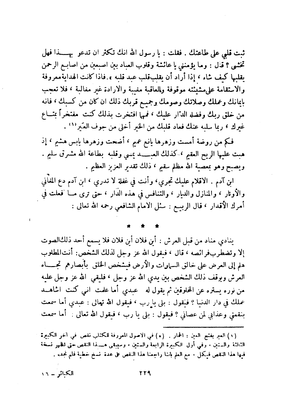 ثَبت قلبِي على طَاعَتك فَقلت يَا رَسُول الله إِنَّك تكْثر أَن تَدْعُو بِهَذَا فَهَل تخشى قَالَ وَمَا يؤمنني يَا عَائِشَة وَقُلُوب الْعباد بَين إِصْبَعَيْنِ من أَصَابِع الرَّحْمَن يقلبها كَيفَ شَاءَ إِذا أَرَادَ أَن يقلب قلب عبد قلبه فَإِذا كَانَت الْهِدَايَة مَعْرُوفَة والاستقامة على مَشِيئَته مَوْقُوفَة وَالْعَاقبَة مغيبة والإرادة غير مغالبة فَلَا تعجب بإيمانك وعملك وصلاتك وصومك وَجَمِيع قربك ذَلِك إِن كَانَ من كسبك فَإِنَّهُ من خلق رَبك وفضله الدَّار عَلَيْك فمهما افتخرت بذلك كنت مفتخرا بمتاع غَيْرك رُبمَا سلبه عَنْك فَعَاد قَلْبك من الْخَيْر أخلى من جَوف العير فكم من رَوْضَة أمست وزهرها يَانِع عميم أضحت وزهرها يَابِس هشيم إِذْ هبت عَلَيْهَا الريح الْعَقِيم كَذَلِك العَبْد يُمْسِي وَقَلبه بِطَاعَة الله مشرق سليم وَيُصْبِح وَهُوَ بِمَعْصِيَة الله مظلم سقيم ذَلِك تَقْدِير الْعَزِيز الْعَظِيم ابْن آدم الأقلام عَلَيْك تجْرِي وَأَنت فِي غَفلَة لَا تَدْرِي ابْن أدم دع المغاني والأوتار والمنازل والديار والتنافس فِي هَذِه الدَّار حَتَّى ترى مَا فعلت فِي أَمرك الأقدار قَالَ الربيع سُئِلَ الإِمَام الشَّافِعِي رَحْمَة الله تَعَالَى يُنَادي مُنَاد من قبل الْعَرْش أَيْن فلَان أَيْن فلَان فَلَا يسمع أحد ذَلِك الصَّوْت إِلَّا وتضطرب فرائصه قَالَ فَيَقُول الله عز وَجل لذَلِك الشَّخْص أَنْت الْمَطْلُوب هَلُمَّ إِلَى الْعرض على خَالق السَّمَاوَات وَالْأَرْض فيشخص الْخلق بِأَبْصَارِهِمْ تجاه الْعَرْش وَيُوقف ذَلِك الشَّخْص بَين يَدي الله عز وَجل فيلقي الله عز وَجل عَلَيْهِ من نوره يستره عَن المخلوقين ثمَّ يَقُول لَهُ عَبدِي أما علمت أَنِّي كنت أشاهد عَمَلك فِي دَار الدُّنْيَا فَيَقُول بلَى يَا رب فَيَقُول الله تَعَالَى عَبدِي أما سَمِعت بنقمتي وعذابي لمن عَصَانِي فَيَقُول بلَى يَا رب فَيَقُول الله تَعَالَى أما سَمِعت