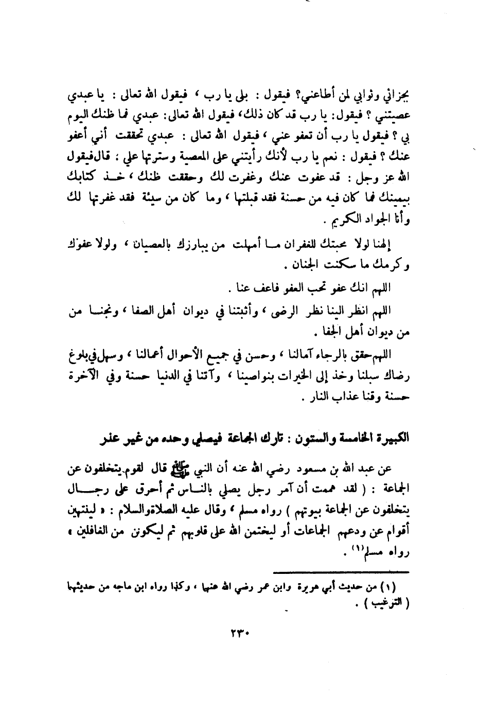 عَن عبد الله بن مَسْعُود رَضِي الله عَنهُ أَن النَّبِي صلى الله عَلَيْهِ وَسلم قَالَ لقوم يتخلفون عَن الْجَمَاعَة (لقد هَمَمْت أَن آمُر رجل يُصَلِّي بِالنَّاسِ ثمَّ أحرق على رجال يتخلفون عَن الْجَمَاعَة بُيُوتهم) رَوَاهُ مُسلم وَقَالَ عَلَيْهِ الصَّلَاة وَالسَّلَام لينتهين أَقوام عَن ودعهم الْجَمَاعَات أَو ليختمن الله على قُلُوبهم ثمَّ لَيَكُونن من الغافلين رَوَاهُ مُسلم