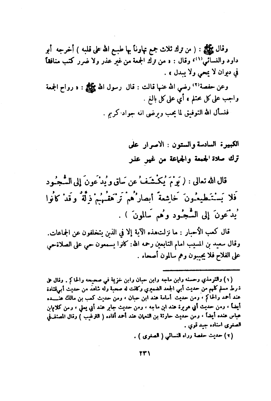 الْكَبِيرَة السَّادِسَة وَالسِّتُّونَ الْإِصْرَار على ترك صَلَاة الْجُمُعَة وَالْجَمَاعَة من غير عذر