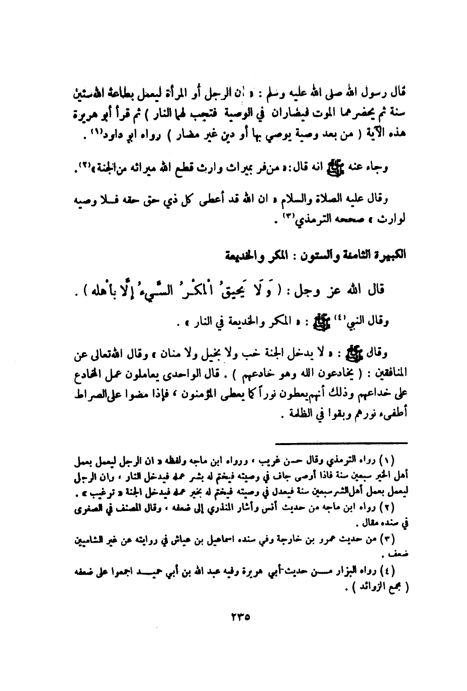 قَالَ رَسُول الله صلى الله عَلَيْهِ وَسلم إِن الرجل أَو الْمَرْأَة ليعْمَل بِطَاعَة الله سِتِّينَ سنة ثمَّ يحضرهما الْمَوْت فيضاران فِي الْوَصِيَّة فَتجب لَهما النَّار) ثمَّ قَرَأَ أَبُو هُرَيْرَة هَذِه الْآيَة من بعد وَصِيَّة يوصى بهَا أَو دين غير مضار رَوَاهُ أَبُو دَاوُد وَجَاء عَنهُ صلى الله عَلَيْهِ وَسلم أَنه قَالَ من فر بميراث وَارِث قطع الله مِيرَاثه من الْجنَّة وَقَالَ عَلَيْهِ الصَّلَاة وَالسَّلَام إِن الله قد أعْطى كل ذِي حق حَقه فَلَا وَصِيَّة لوَارث صَححهُ التِّرْمِذِيّ