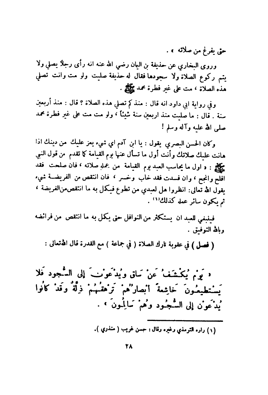 حَتَّى يفرغ من صلَاته وروى البُخَارِيّ عَن حُذَيْفَة بن الْيَمَان رَضِي الله عَنهُ أَنه رأى رجلا يُصَلِّي وَلَا يتم رُكُوع الصَّلَاة وَلَا سجودها فَقَالَ لَهُ حُذَيْفَة صليت وَلَو مت وَأَنت تصلي هَذِه الصَّلَاة مت على غير فطْرَة مُحَمَّد صلى الله عَلَيْهِ وَسلم وَفِي رِوَايَة أبي دَاوُد أَنه قَالَ مُنْذُ كم تصلي هَذِه الصَّلَاة قَالَ مُنْذُ أَرْبَعِينَ سنة قَالَ مَا صليت مُنْذُ أَرْبَعِينَ سنة شَيْئا وَلَو مت مت على غير فطْرَة مُحَمَّد صلى الله عَلَيْهِ وَسلم وَكَانَ الْحسن الْبَصْرِيّ يَقُول يَا ابْن آدم أَي شَيْء يعز عَلَيْك من دينك إِذا هَانَتْ عَلَيْك صَلَاتك وَأَنت أول مَا تسْأَل عَنْهَا يَوْم الْقِيَامَة كَمَا تقدم من قَول النَّبِي صلى الله عَلَيْهِ وَسلم أول مَا يُحَاسب العَبْد يَوْم الْقِيَامَة من عمله صلَاته فَإِن صلحت فقد أَفْلح وأنجح وَإِن فَسدتْ فقد خَابَ وخسر فَإِن انْتقصَ من الْفَرِيضَة شَيْء يَقُول الله تَعَالَى انْظُرُوا هَل لعبدي من تطوع فيكمل بِهِ مَا انْتقصَ من الْفَرِيضَة ثمَّ يكون سَائِر عمله كَذَلِك فَيَنْبَغِي للْعَبد أَن يستكثر من النَّوَافِل حَتَّى يكمل بِهِ مَا انْتقصَ من فَرَائِضه وَبِاللَّهِ التَّوْفِيق
