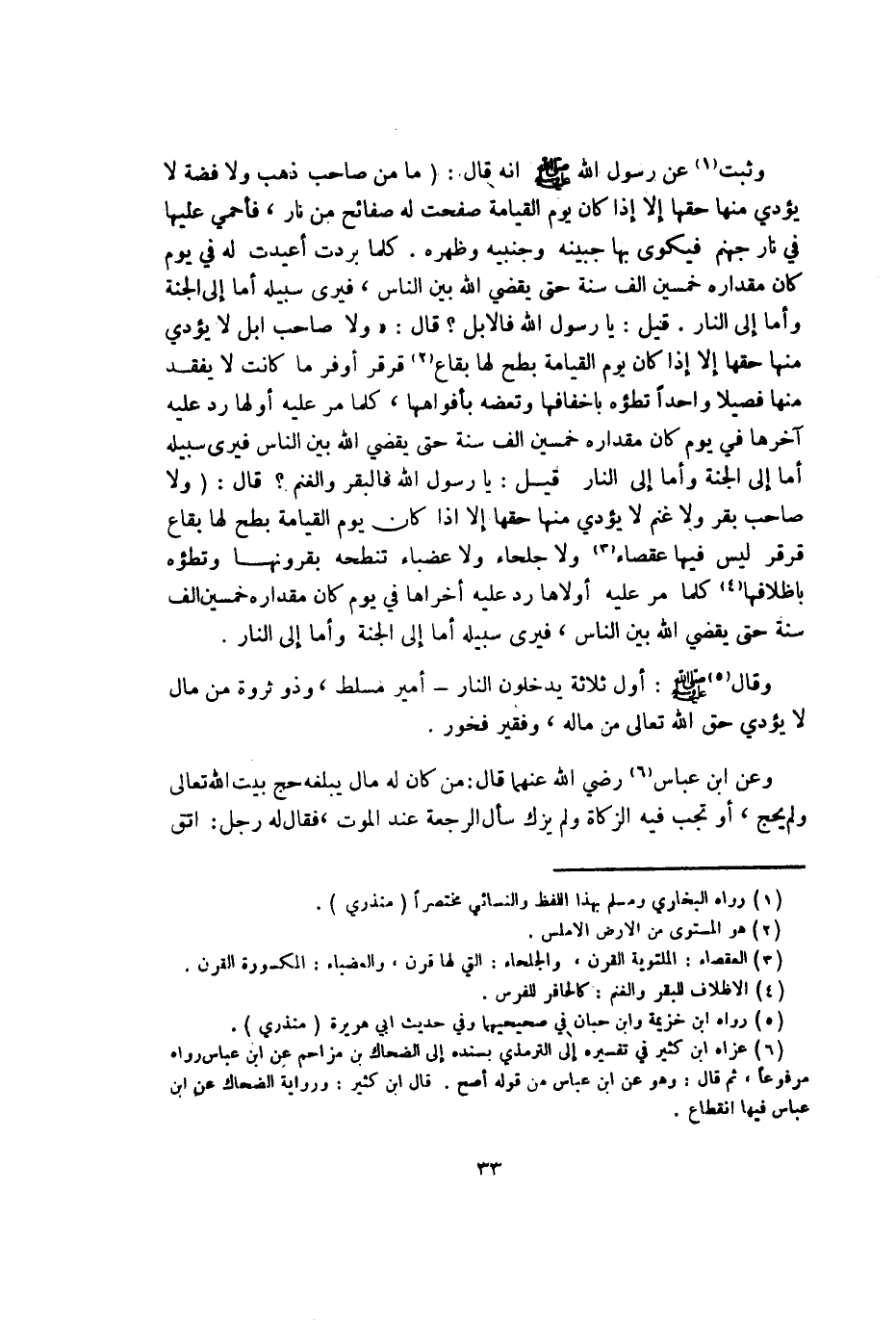 وَثَبت عَن رَسُول الله صلى الله عَلَيْهِ وَسلم أَنه قَالَ (مَا من صَاحب ذهب وَلَا فضَّة لَا يُؤَدِّي مِنْهَا حَقّهَا إِلَّا إِذا كَانَ يَوْم الْقِيَامَة صفحت لَهُ صَفَائِح من نَار فأحمي عَلَيْهَا فِي نَار جَهَنَّم فيكوى بهَا جَبينه وجنبيه وظهره كلما بردت أُعِيدَت لَهُ فِي يَوْم كَانَ مِقْدَاره خمسين ألف سنة حَتَّى يقْضِي الله بَين النَّاس فَيرى سَبيله إِمَّا إِلَى الْجنَّة وَأما إِلَى النَّار قيل يَا رَسُول الله فالإبل قَالَ وَلَا صَاحب إبل لَا يُؤَدِّي مِنْهَا حَقّهَا إِلَّا إِذا كَانَ يَوْم الْقِيَامَة بطح لَهَا بقاع قرقر أوفر مَا كَانَت لَا يفقد مِنْهَا فصيلاً وَاحِدًا تطؤه بأخفافها وتعضه بأفواهها كلما مر عَلَيْهِ أَولهَا رد عَلَيْهِ آخرهَا فِي يَوْم كَانَ مِقْدَاره خمسين ألف سنة حَتَّى يقْضِي الله بَين النَّاس فَيرى سَبيله إِمَّا إِلَى الْجنَّة وَأما إِلَى النَّار قيل يَا رَسُول الله فالبقر وَالْغنم قَالَ (وَلَا صَاحب بقر وَلَا غنم لَا يُؤَدِّي مِنْهَا حَقّهَا إِلَّا إِذا كَانَ يَوْم الْقِيَامَة بطح لَهَا بقاع قرقر لَيْسَ فِيهَا عقصاء وَلَا جلحاء وَلَا عضباء تنطحه بقرونها وتطؤه بأظلافها كلما مر عَلَيْهِ أولاها رد عَلَيْهِ أخراها فِي يَوْم كَانَ مِقْدَاره خمسين ألف سنة حَتَّى يقْضِي الله بَين النَّاس فَيرى سَبيله إِمَّا إِلَى الْجنَّة وَأما إِلَى النَّار وَقَالَ صلى الله عَلَيْهِ وَسلم أول ثَلَاثَة يدْخلُونَ النَّار أَمِير مسلط وَذُو ثروة من مَال لَا يُؤَدِّي حق الله تَعَالَى من مَاله وفقير فخور وَعَن ابْن عَبَّاس رَضِي الله عَنْهُمَا قَالَ من كَانَ لَهُ مَال يبلغهُ حج بَيت الله تَعَالَى وَلم يحج أَو تجب فِيهِ الزَّكَاة وَلم يزك سَأَلَ الرّجْعَة عِنْد الْمَوْت فَقَالَ لَهُ رجل اتَّقِ