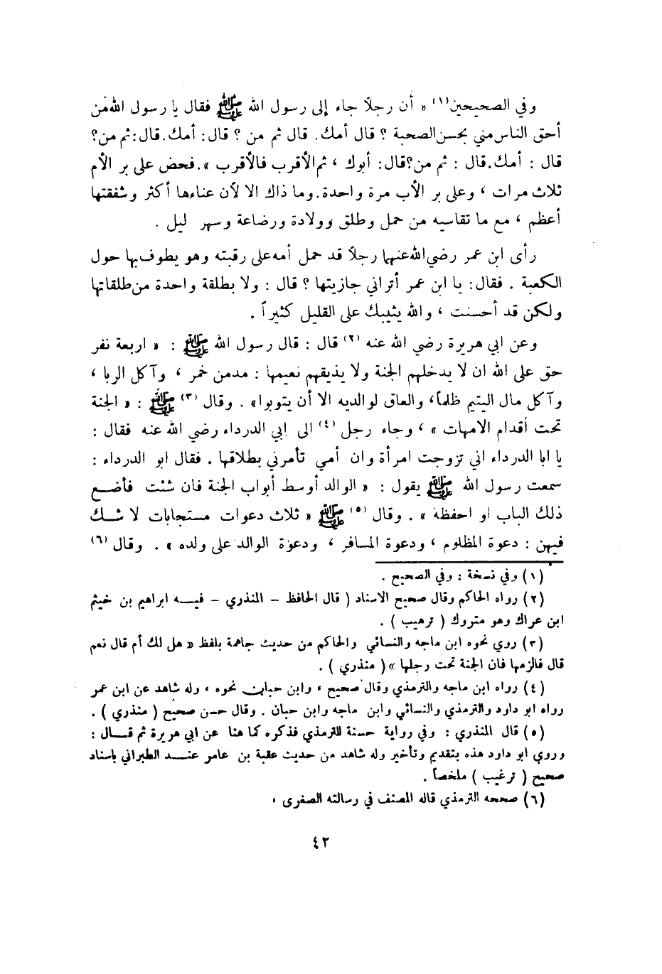 وَفِي الصَّحِيحَيْنِ أَن رجلاً جَاءَ إِلَى رَسُول الله صلى الله عَلَيْهِ وَسلم فَقَالَ يَا رَسُول الله من أَحَق النَّاس مني بِحسن الصُّحْبَة قَالَ أمك قَالَ ثمَّ من قَالَ أمك قَالَ ثمَّ من قَالَ أمك قَالَ ثمَّ من قَالَ أَبوك ثمَّ الْأَقْرَب فَالْأَقْرَب فحض على بر الْأُم ثَلَاث مَرَّات وعَلى بر الْأَب مرة وَاحِدَة وَمَا ذَاك إِلَّا لِأَن عناءها أَكثر وشفقتها أعظم مَعَ مَا تقاسيه من حمل وطلق وولادة ورضاعة وسهر ليل رأى ابْن عمر رَضِي الله عَنْهُمَا قد حمل أمه على رقبته وَهُوَ يطوف بهَا حول الْكَعْبَة فَقَالَ يَا ابْن عمر أَترَانِي جَازَيْتهَا قَالَ وَلَا بِطَلْقَة وَاحِدَة من طلقاتها وَلَكِن قد أَحْسَنت وَالله يثيبك على الْقَلِيل كثيراً وَعَن أبي هُرَيْرَة رَضِي الله عَنهُ قَالَ قَالَ رَسُول الله صلى الله عَلَيْهِ وَسلم أَرْبَعَة نفر حق على الله أَن لَا يدخلهم الْجنَّة وَلَا يذيقهم نعيمها مدمن خمر وآكل الرِّبَا وآكل مَال الْيَتِيم ظلماً والعاق لوَالِديهِ إِلَّا أَن يتوبوا وَقَالَ صلى الله عَلَيْهِ وَسلم الْجنَّة تَحت أَقْدَام الْأُمَّهَات وَجَاء رجل إِلَى أبي الدَّرْدَاء رَضِي الله عَنهُ فَقَالَ يَا أَبَا الدَّرْدَاء إِنِّي تزوجت امْرَأَة وَإِن أُمِّي تَأْمُرنِي بِطَلَاقِهَا فَقَالَ أَبُو الدَّرْدَاء سَمِعت رَسُول الله صلى الله عَلَيْهِ وَسلم يَقُول الْوَالِد أَوسط أَبْوَاب الْجنَّة فَإِن شِئْت فأضع ذَلِك الْبَاب أَو احفظه وَقَالَ صلى الله عَلَيْهِ وَسلم ثَلَاث دعوات مستجابات لَا شك فِيهِنَّ دَعْوَة الْمَظْلُوم ودعوة الْمُسَافِر ودعوة الْوَالِد على وَلَده وَقَالَ