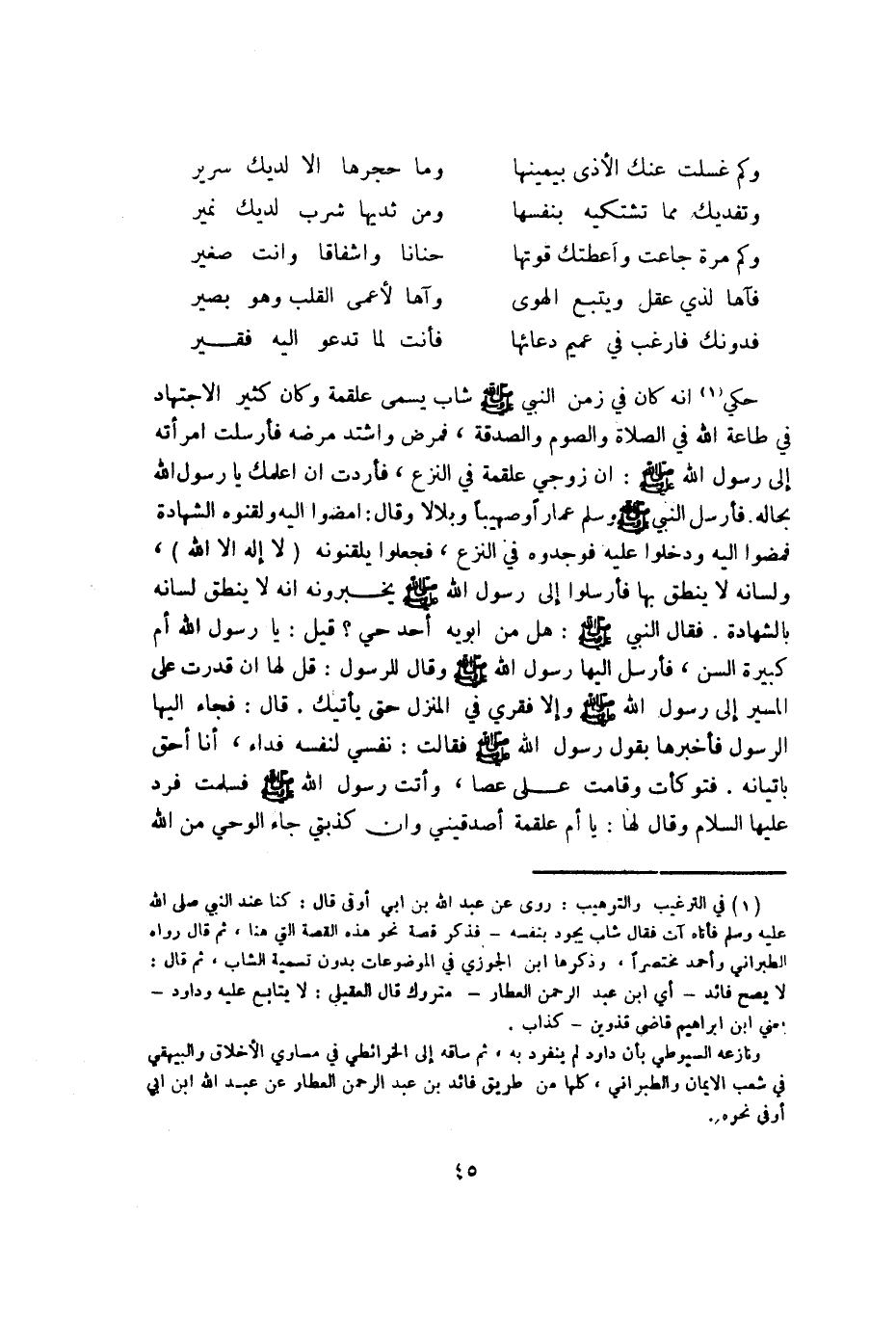 حُكيَ أَنه كَانَ فِي زمن النَّبِي صلى الله عَلَيْهِ وَسلم شَاب يُسمى عَلْقَمَة وَكَانَ كثير الاجتهاد فِي طَاعَة الله فِي الصَّلَاة وَالصَّوْم وَالصَّدَََقَة فَمَرض وَاشْتَدَّ مَرضه فَأرْسلت امْرَأَته إِلَى رَسُول الله صلى الله عَلَيْهِ وَسلم إِن زَوجي عَلْقَمَة فِي النزع فَأَرَدْت أَن أعلمك يَا رَسُول الله بِحَالهِ فَأرْسل النَّبِي صلى الله عَلَيْهِ وَسلم عماراً وصهيباً وبلالاً وَقَالَ امضوا إِلَيْهِ ولقنوه الشَّهَادَة فَمَضَوْا إِلَيْهِ ودخلوا عَلَيْهِ فوجدوه فِي النزع فَجعلُوا يلقنونه (لَا إِلَه إِلَّا الله) وَلسَانه لَا ينْطق بهَا فأرسلوا إِلَى رَسُول الله صلى الله عَلَيْهِ وَسلم يخبرونه أَنه لَا ينْطق لِسَانه بِالشَّهَادَةِ فَقَالَ النَّبِي صلى الله عَلَيْهِ وَسلم هَل من أَبَوَيْهِ أحد حَيّ قيل يَا رَسُول الله أم كَبِيرَة السن فَأرْسل إِلَيْهَا رَسُول الله صلى الله عَلَيْهِ وَسلم وَقَالَ للرسول قل لَهَا إِن قدرت على الْمسير إِلَى رَسُول الله صلى الله عَلَيْهِ وَسلم وَإِلَّا فقري فِي الْمنزل حَتَّى يَأْتِيك قَالَ فجَاء إِلَيْهَا الرَّسُول فَأَخْبرهَا بقول رَسُول الله صلى الله عَلَيْهِ وَسلم فَقَالَت نَفسِي لنَفسِهِ فدَاء أَنا أَحَق بإتيانه فتوكأت وَقَامَت على عَصا وَأَتَتْ رَسُول الله صلى الله عَلَيْهِ وَسلم فَسلمت فَرد عَلَيْهَا السَّلَام وَقَالَ لَهَا يَا أم عَلْقَمَة أصدقيني وَإِن كذبتي جَاءَ الْوَحْي من الله