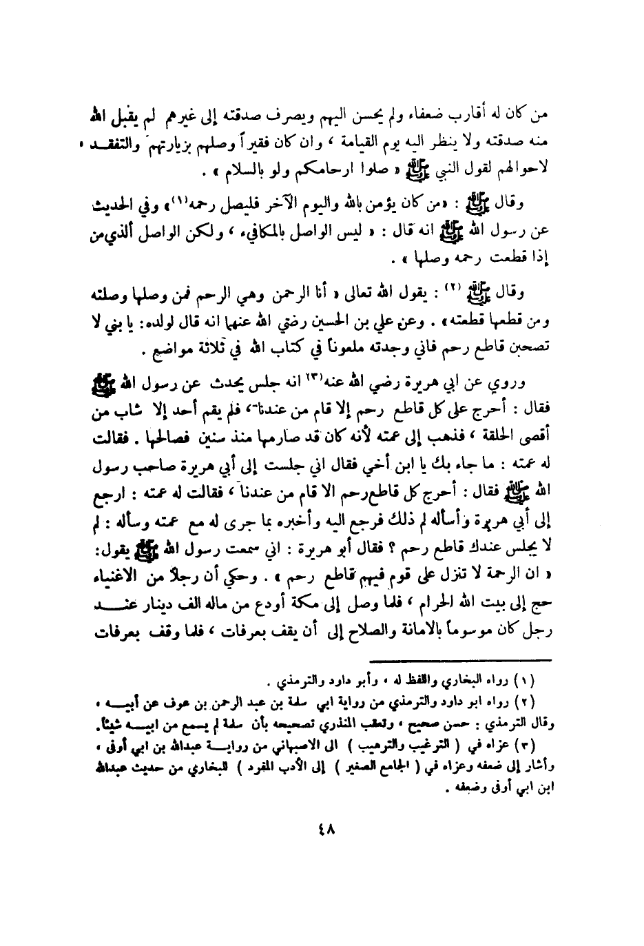 من كَانَ لَهُ أقَارِب ضعفاء وَلم يحسن إِلَيْهِم وَيصرف صدقته إِلَى غَيرهم لم يقبل الله مِنْهُ صدقته وَلَا ينظر إِلَيْهِ يَوْم الْقِيَامَة وَإِن كَانَ فَقِيرا وصلهم بزيارتهم والتفقد لأحوالهم لقَوْل النَّبِي صلى الله عَلَيْهِ وَسلم صلوا أَرْحَامكُم وَلَو بِالسَّلَامِ وَقَالَ صلى الله عَلَيْهِ وَسلم من كَانَ يُؤمن بِاللَّه وَالْيَوْم الآخر فَليصل رَحمَه وَفِي الحَدِيث عَن رَسُول الله صلى الله عَلَيْهِ وَسلم أَنه قَالَ لَيْسَ الْوَاصِل بالمكافئ وَلَكِن الْوَاصِل الَّذِي من إِذا قطعت رَحمَه وَصلهَا وَقَالَ صلى الله عَلَيْهِ وَسلم يَقُول الله تَعَالَى أَنا الرَّحْمَن وَهِي الرَّحِم فَمن وَصلهَا وصلته وَمن قطعهَا قطعته وَعَن عَليّ بن الْحُسَيْن رَضِي الله عَنْهُمَا أَنه قَالَ لوَلَده يَا بني لَا تصحبن قَاطع رحم فَإِنِّي وجدته ملعوناً فِي كتاب الله فِي ثَلَاثَة مَوَاضِع وَرُوِيَ عَن أبي هُرَيْرَة رَضِي الله عَنهُ أَنه جلس يحدث عَن رَسُول الله صلى الله عَلَيْهِ وَسلم فَقَالَ أحرج على كل قَاطع رحم إِلَّا قَامَ من عندنَا فَلم يقم أحد إِلَّا شَاب من أقْصَى الْحلقَة فَذهب إِلَى عمته لِأَنَّهُ كَانَ قد صارمها مُنْذُ سِنِين فصالحها فَقَالَت لَهُ عمته مَا جَاءَ بك يَا ابْن أخي فَقَالَ إِنِّي جَلَست إِلَى أبي هُرَيْرَة صَاحب رَسُول الله صلى الله عَلَيْهِ وَسلم فَقَالَ أحرج كل قَاطع رحم إِلَّا قَامَ من عندنَا فَقَالَت لَهُ عمته ارْجع إِلَى أبي هُرَيْرَة واسأله لم ذَلِك فَرجع إِلَيْهِ وَأخْبرهُ بِمَا جرى لَهُ مَعَ عمته وَسَأَلَهُ لم لَا يجلس عنْدك قَاطع رحم فَقَالَ أَبُو هُرَيْرَة إِنِّي سَمِعت رَسُول الله صلى الله عَلَيْهِ وَسلم يَقُول إِن الرَّحْمَة لَا تنزل على قوم فيهم قَاطع رحم وَحكي أَن رجلاً من الْأَغْنِيَاء حج إِلَى بَيت الله الْحَرَام فَلَمَّا وصل إِلَى مَكَّة أودع من مَاله ألف دِينَار عِنْد رجل كَانَ موسوماً بالأمانة وَالصَّلَاح إِلَى أَن يقف بِعَرَفَات فَلَمَّا وقف بِعَرَفَات