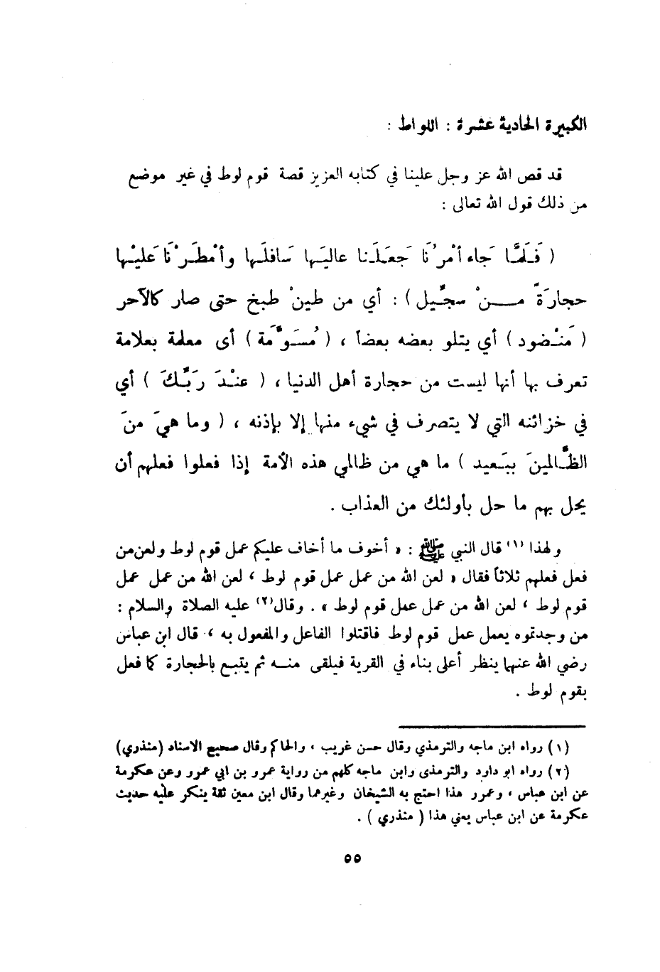 قد قص الله عز وَجل علينا فِي كِتَابه الْعَزِيز قصَّة قوم لوط فِي غير مَوضِع من ذَلِك قَول الله تَعَالَى {فَلَمَّا جَاءَ أمرنَا جعلنَا عاليها سافلها وأمطرنا عَلَيْهَا حِجَارَة من سجيل} أَي من طين طبخ حَتَّى صَار كالآحر منضود أَي يَتْلُو بعضه بَعْضًا مسومة أَي معلمة بعلامة تعرف بهَا أَنَّهَا لَيست من حِجَارَة أهل الدُّنْيَا عِنْد رَبك أَي فِي خزائنه الَّتِي لَا يتَصَرَّف فِي شَيْء مِنْهَا إِلَّا بِإِذْنِهِ وَمَا هِيَ من الظَّالِمين بِبَعِيد مَا هِيَ من ظالمي هَذِه الْأمة إِذا فعلوا فعلهم أَن يحل بهم مَا حل بأولئك من الْعَذَاب وَلِهَذَا قَالَ النَّبِي صلى الله عَلَيْهِ وَسلم أخوف مَا أَخَاف عَلَيْكُم عمل قوم لوط وَلعن من فعل فعلهم ثَلَاثًا فَقَالَ لعن الله من عمل عمل قوم لوط لعن الله من عمل عمل قوم لوط لعن الله من عمل عمل قوم لوط وَقَالَ عَلَيْهِ الصَّلَاة وَالسَّلَام من وجدتموه يعْمل عمل قوم لوط فَاقْتُلُوا الْفَاعِل وَالْمَفْعُول بِهِ قَالَ ابْن عَبَّاس رَضِي الله عَنْهُمَا ينظر أَعلَى بِنَاء فِي الْقرْيَة فَيلقى مِنْهُ ثمَّ يتبع بِالْحِجَارَةِ كَمَا فعل بِقوم لوط