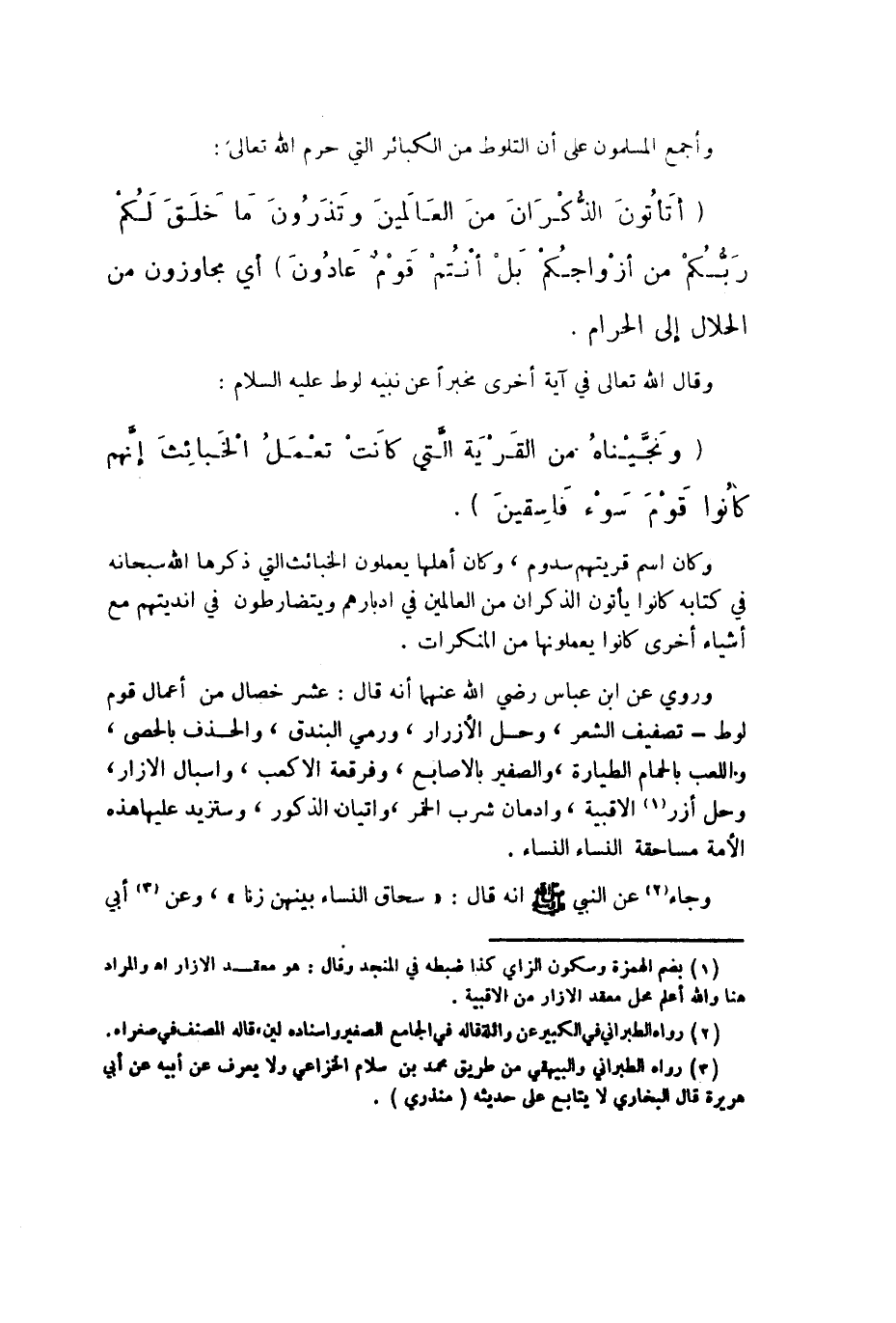 وَأجْمع الْمُسلمُونَ على أَن التلوط من الْكَبَائِر الَّتِي حرم الله تَعَالَى أتأتون الذكران من الْعَالمين وتذرون مَا خلق لكم ربكُم من أزواجكم بل أَنْتُم قوم عادون أَي مجاوزون من الْحَلَال إِلَى الْحَرَام وَقَالَ الله تَعَالَى فِي آيَة أُخْرَى مخبراً عَن نبيه لوط عَلَيْهِ السَّلَام ونجيناه من الْقرْيَة الَّتِي كَانَت تعْمل الْخَبَائِث إِنَّهُم كَانُوا قوم سوء فاسقين وَكَانَ اسْم قريتهم سدوم وَكَانَ أَهلهَا يعْملُونَ الْخَبَائِث الَّتِي ذكرهَا الله سُبْحَانَهُ فِي كِتَابه كَانُوا يأْتونَ الذكران من الْعَالمين فِي أدبارهم ويتضارطون فِي أَنْدِيَتهمْ مَعَ أَشْيَاء أُخْرَى كَانُوا يعملونها من الْمُنْكَرَات وَرُوِيَ عَن ابْن عَبَّاس رَضِي الله عَنْهُمَا أَنه قَالَ عشر خِصَال من أَعمال قوم لوط تصفيف الشّعْر وَحل الأزرار وَرمي البندق والحذف بالحصى واللعب بالحمام الطيارة والصفير بالأصابع وفرقعة الأكعب وإسبال الْإِزَار وَحل أزر الأقبية وإدمان شرب الْخمر وإتيان الذُّكُور وستزيد عَلَيْهَا هَذِه الْأمة مساحقة النِّسَاء النِّسَاء وَجَاء عَن النَّبِي صلى الله عَلَيْهِ وَسلم أَنه قَالَ سحاق النِّسَاء بَينهُنَّ زنا وَعَن أبي