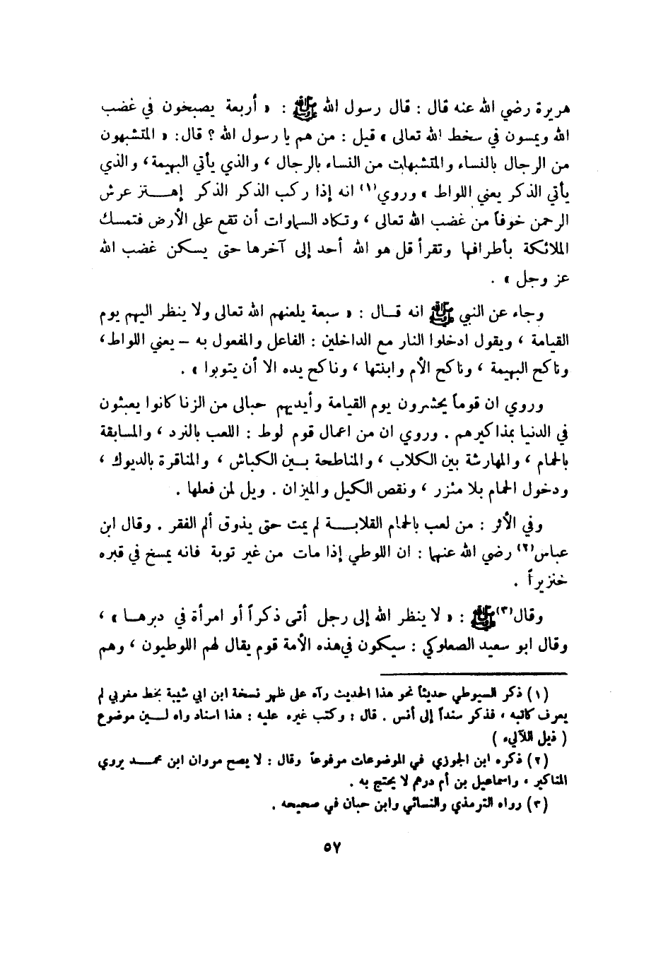 هُرَيْرَة رَضِي الله عَنهُ قَالَ قَالَ رَسُول الله صلى الله عَلَيْهِ وَسلم أَرْبَعَة يُصْبِحُونَ فِي غضب الله وَيُمْسُونَ فِي سخط الله تَعَالَى قيل من هم يَا رَسُول الله قَالَ المتشبهون من الرِّجَال بِالنسَاء والمتشبهات من النِّسَاء بِالرِّجَالِ وَالَّذِي يَأْتِي الْبَهِيمَة وَالَّذِي يَأْتِي الذكر يَعْنِي اللواط وَرُوِيَ أَنه إِذا ركب الذكر الذكر اهتز عرش الرَّحْمَن خوفاً من غضب الله تَعَالَى وتكاد السَّمَاوَات أَن تقع على الأَرْض فتمسك الْمَلَائِكَة بأطرافها وتقرأ قل هُوَ الله أحد إِلَى آخرهَا حَتَّى يسكن غضب الله عز وَجل وَجَاء عَن النَّبِي صلى الله عَلَيْهِ وَسلم أَنه قَالَ سَبْعَة يلعنهم الله تَعَالَى وَلَا ينظر إِلَيْهِم يَوْم الْقِيَامَة وَيَقُول ادخُلُوا النَّار مَعَ الداخلين الْفَاعِل وَالْمَفْعُول بِهِ يَعْنِي اللواط وناكح الْبَهِيمَة وناكح الْأُم وابنتها وناكح يَده إِلَّا أَن يتوبوا وَرُوِيَ أَن قوما يحشرون يَوْم الْقِيَامَة وأيديهم حبالى من الزِّنَا كَانُوا يعبثون فِي الدُّنْيَا بمذاكيرهم وَرُوِيَ أَن من أَعمال قوم لوط اللعب بالنرد والمسابقة بالحمام والمهارشة بَين الْكلاب والمناطحة بَين الكباش والمناقرة بالديوك وَدخُول الْحمام بِلَا مئزر وَنقص الْكَيْل وَالْمِيزَان ويل لمن فعلهَا وَفِي الْأَثر من لعب بالحمام القلابة لم يمت حَتَّى يَذُوق ألم الْفقر وَقَالَ ابْن عَبَّاس رَضِي الله عَنْهُمَا أَن اللوطي إِذا مَاتَ من غير تَوْبَة فَإِنَّهُ يمسخ فِي قَبره خنزيراً وَقَالَ صلى الله عَلَيْهِ وَسلم لَا ينظر الله إِلَى رجل أَتَى ذكرا أَو امْرَأَة فِي دبرهَا وَقَالَ أَبُو سعيد الصعلوكي سَيكون فِي هَذِه الْأمة قوم يُقَال لَهُم اللوطيون وهم