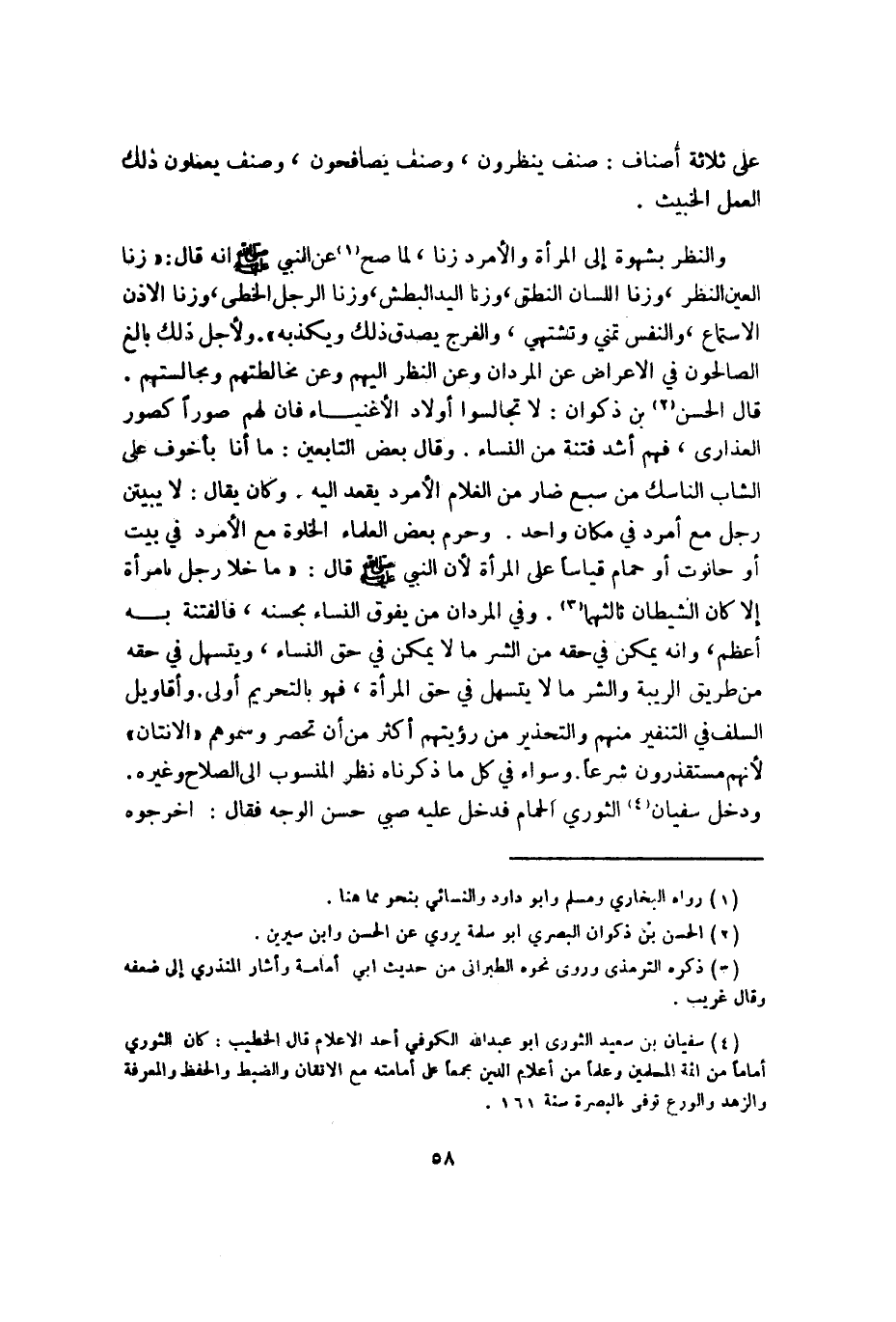 على ثَلَاثَة أَصْنَاف صنف ينظرُونَ وصنف يصافحون وصنف يعْملُونَ ذَلِك الْعَمَل الْخَبيث وَالنَّظَر بِشَهْوَة إِلَى الْمَرْأَة والأمرد زنا لما صَحَّ عَن النَّبِي صلى الله عَلَيْهِ وَسلم أَنه قَالَ زنا الْعين النظر وزنا اللِّسَان النُّطْق وزنا الْيَد الْبَطْش وزنا الرجل الخطى وزنا الْأذن الِاسْتِمَاع وَالنَّفس تمني وتشتهي والفرج يصدق ذَلِك ويكذبه وَلأَجل ذَلِك بَالغ الصالحون فِي الْإِعْرَاض عَن المردان وَعَن النظر إِلَيْهِم وَعَن مخالطتهم ومجالستهم قَالَ الْحسن بن ذكْوَان لَا تجالسوا أَوْلَاد الْأَغْنِيَاء فَإِن لَهُم صوراً كصور العذارى فهم أَشد فتْنَة من النِّسَاء وَقَالَ بعض التَّابِعين مَا أَنا بأخوف على الشَّاب الناسك من سبع ضار من الْغُلَام الْأَمْرَد يقْعد إِلَيْهِ وَكَانَ يُقَال لَا يبيتن رجل مَعَ أَمْرَد فِي مَكَان وَاحِد وَحرم بعض الْعلمَاء الْخلْوَة مَعَ الْأَمْرَد فِي بَيت أَو حَانُوت أَو حمام قِيَاسا على الْمَرْأَة لِأَن النَّبِي صلى الله عَلَيْهِ وَسلم قَالَ مَا خلا رجل بِامْرَأَة إِلَّا كَانَ الشَّيْطَان ثالثهما وَفِي المردان من يفوق النِّسَاء بحسنه فالفتنة بِهِ أعظم وَأَنه يُمكن فِي حَقه من الشَّرّ مَا لَا يُمكن فِي حق النِّسَاء ويتسهل فِي حَقه من طَرِيق الرِّيبَة وَالشَّر مَا لَا يتسهل فِي حق الْمَرْأَة فَهُوَ بِالتَّحْرِيمِ أولى وأقاويل السلف فِي التنفير مِنْهُم والتحذير من رُؤْيَتهمْ أَكثر من أَن تحصر وسموهم الأنتان لأَنهم مستقذرون شرعاً وَسَوَاء فِي كل مَا ذَكرْنَاهُ نظر الْمَنْسُوب إِلَى الصلاح وَغَيره وَدخل سُفْيَان الثَّوْريّ الْحمام فَدخل عَلَيْهِ صبي حسن الْوَجْه فَقَالَ أَخْرجُوهُ