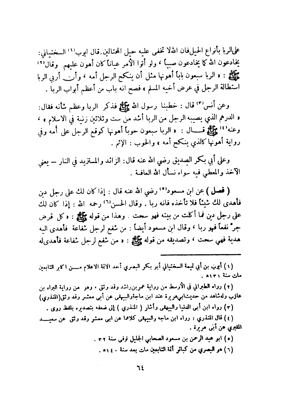 عَن ابْن مَسْعُود رَضِي الله عَنهُ قَالَ إِذا كَانَ لَك على رجل دين فأهدى لَك شَيْئا فَلَا تَأْخُذهُ فَإِنَّهُ رَبًّا وَقَالَ الْحسن رَحمَه الله إِذا كَانَ لَك على رجل دين فَمَا أكلت من بَيته فَهُوَ سحت وَهَذَا من قَوْله صلى الله عَلَيْهِ وَسلم كل قرض جر نفعاً فَهُوَ رَبًّا وَقَالَ ابْن مَسْعُود أَيْضا من شفع لرجل شَفَاعَة فأهدى لَهُ هَدِيَّة فَهِيَ سحت وتصديقه من قَوْله صلى الله عَلَيْهِ وَسلم من شفع لرجل شَفَاعَة فأهدى لَهُ