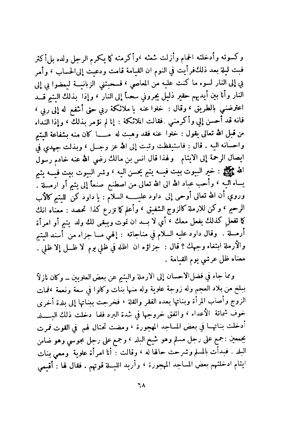 وَكسوته وأدخلته الْحمام وأزلت شعثه وأكرمته كَمَا يكرم الرجل وَلَده بل أَكثر فَبت لَيْلَة بعد ذَلِك فَرَأَيْت فِي النوم أَن الْقِيَامَة قَامَت ودعيت إِلَى الْحساب وَأمر بِي إِلَى النَّار لسوء مَا كنت عَلَيْهِ من الْمعاصِي فسحبتني الزَّبَانِيَة ليمضوا بِي إِلَى النَّار وَأَنا بَين أَيْديهم حقير ذليل يجروني سحباً إِلَى النَّار وَإِذا بذلك الْيَتِيم قد اعترضني بِالطَّرِيقِ وَقَالَ خلوا عَنهُ يَا مَلَائِكَة رَبِّي حَتَّى أشفع لَهُ إِلَى رَبِّي فَإِنَّهُ قد أحسن إِلَيّ وأكرمني فَقَالَت الْمَلَائِكَة إِنَّا لم نؤمر بذلك وَإِذا النداء من قبل الله تَعَالَى يَقُول خلوا عَنهُ فقد وهبت لَهُ مَا كَانَ مِنْهُ بشفاعة الْيَتِيم وإحسانه إِلَيْهِ قَالَ فَاسْتَيْقَظت وتبت إِلَى الله عز وَجل وبذلت جهدي فِي إِيصَال الرَّحْمَة إِلَى الْأَيْتَام وَلِهَذَا قَالَ أنس بن مَالك رَضِي الله عَنهُ خَادِم رَسُول الله صلى الله عَلَيْهِ وَسلم خير الْبيُوت بَيت فِيهِ يَتِيم يحسن إِلَيْهِ وَشر الْبيُوت بَيت فِيهِ يَتِيم يساء إِلَيْهِ وَأحب عباد الله إِلَى الله تَعَالَى من اصْطنع صنعاً إِلَى يَتِيم أَو أرملة وَرُوِيَ إِن الله تَعَالَى أوحى إِلَى دَاوُد عَلَيْهِ السَّلَام يَا دَاوُد كن للْيَتِيم كَالْأَبِ الرَّحِيم وَكن للأرملة كالزوج الشفيق وَاعْلَم كَمَا تزرع كَذَا تحصد مَعْنَاهُ أَنَّك كَمَا تفعل كَذَلِك يفعل مَعَك أَي لَا بُد أَن تَمُوت وَيبقى لَك ولد يَتِيم أَو امْرَأَة أرملة وَقَالَ دَاوُد عَلَيْهِ السَّلَام فِي مناجاته إلهي مَا جَزَاء من أسْند الْيَتِيم والأرملة ابْتِغَاء وَجهك قَالَ جَزَاؤُهُ أَن أظلهُ فِي ظِلِّي يَوْم لَا ظل إِلَّا ظِلِّي مَعْنَاهُ ظل عَرْشِي يَوْم الْقِيَامَة وَمِمَّا جَاءَ فِي فضل الْإِحْسَان إِلَى الأرملة واليتيم عَن بعض العلويين وَكَانَ نازلاً ببلخ من بِلَاد الْعَجم وَله زَوْجَة علوِيَّة وَله مِنْهَا بَنَات وَكَانُوا فِي سَعَة ونعمة فَمَاتَ الزَّوْج وَأصَاب الْمَرْأَة وبناتها بعده الْفقر والقلة فَخرجت ببناتها إِلَى بَلْدَة أُخْرَى خوف شماتة الْأَعْدَاء وَاتفقَ خُرُوجهَا فِي شدَّة الْبرد فَلَمَّا دخلت ذَلِك الْبَلَد أدخلت بناتها فِي بعض الْمَسَاجِد المهجورة وَمَضَت تحتال لَهُم فِي الْقُوت فمرت بجمعين جمع على رجل مُسلم وَهُوَ شيخ الْبَلَد وَجمع على رجل مَجُوسِيّ وَهُوَ ضَامِن الْبَلَد فَبَدَأت بِالْمُسلمِ وشرحت حَالهَا لَهُ وَقَالَت أَنا امْرَأَة علوِيَّة وَمَعِي بَنَات أَيْتَام أدخلتهم بعض الْمَسَاجِد المهجورة وَأُرِيد اللَّيْلَة قوتهم فَقَالَ لَهَا أقيمي