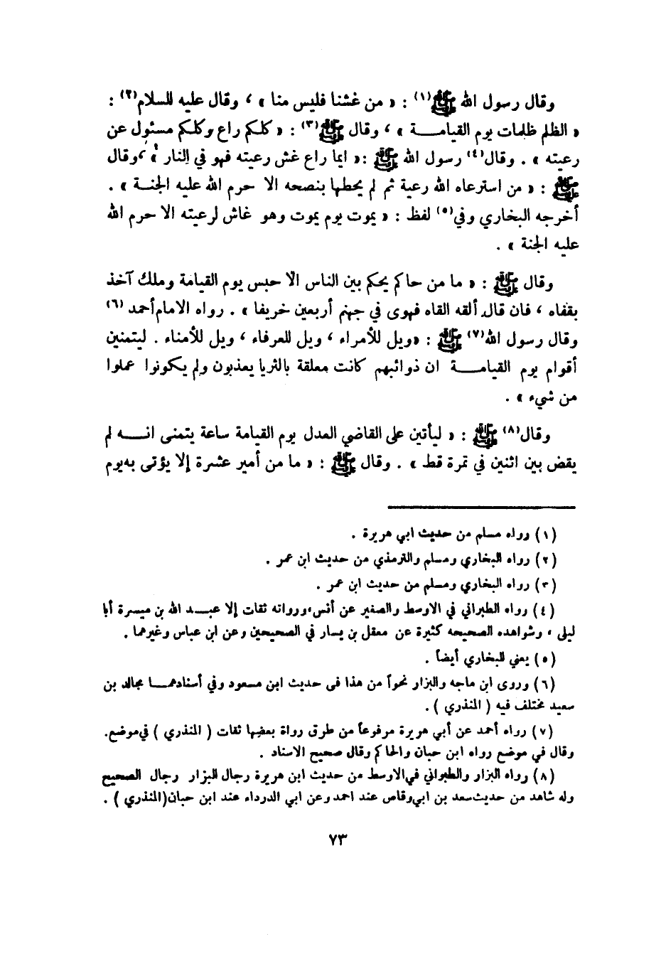 وَقَالَ رَسُول الله صلى الله عَلَيْهِ وَسلم من غَشنَا فَلَيْسَ منا وَقَالَ عَلَيْهِ السَّلَام الظُّلم ظلمات يَوْم الْقِيَامَة وَقَالَ صلى الله عَلَيْهِ وَسلم كلكُمْ رَاع وكلكم مسئول عَن رَعيته وَقَالَ رَسُول الله صلى الله عَلَيْهِ وَسلم أَيّمَا رَاع غش رَعيته فَهُوَ فِي النَّار وَقَالَ صلى الله عَلَيْهِ وَسلم من استرعاه الله رعية ثمَّ لم يحطهَا بنصحه إِلَّا حرم الله عَلَيْهِ الْجنَّة أخرجه البُخَارِيّ وَفِي لفظ يَمُوت يَوْم يَمُوت وَهُوَ غاش لرعيته إِلَّا حرم الله عَلَيْهِ الْجنَّة وَقَالَ صلى الله عَلَيْهِ وَسلم مَا من حَاكم يحكم بَين النَّاس إِلَّا حبس يَوْم الْقِيَامَة وَملك آخذ بقفاه فَإِن قَالَ ألقه أَلْقَاهُ فهوى فِي جَهَنَّم أَرْبَعِينَ خَرِيفًا رَوَاهُ الإِمَام أَحْمد وَقَالَ رَسُول الله صلى الله عَلَيْهِ وَسلم ويل لِلْأُمَرَاءِ ويل للعرفاء ويل للأمناء ليتمنين أَقوام يَوْم الْقِيَامَة أَن ذوائبهم كَانَت معلقَة بِالثُّرَيَّا يُعَذبُونَ وَلم يَكُونُوا عمِلُوا من شَيْء وَقَالَ صلى الله عَلَيْهِ وَسلم ليَأْتِيَن على القضاي الْعدْل يَوْم الْقِيَامَة سَاعَة يتَمَنَّى أَنه لم يقْض بَين اثْنَيْنِ فِي تَمْرَة قط وَقَالَ صلى الله عَلَيْهِ وَسلم مَا من أَمِير عشرَة إِلَّا يُؤْتى بِهِ يَوْم