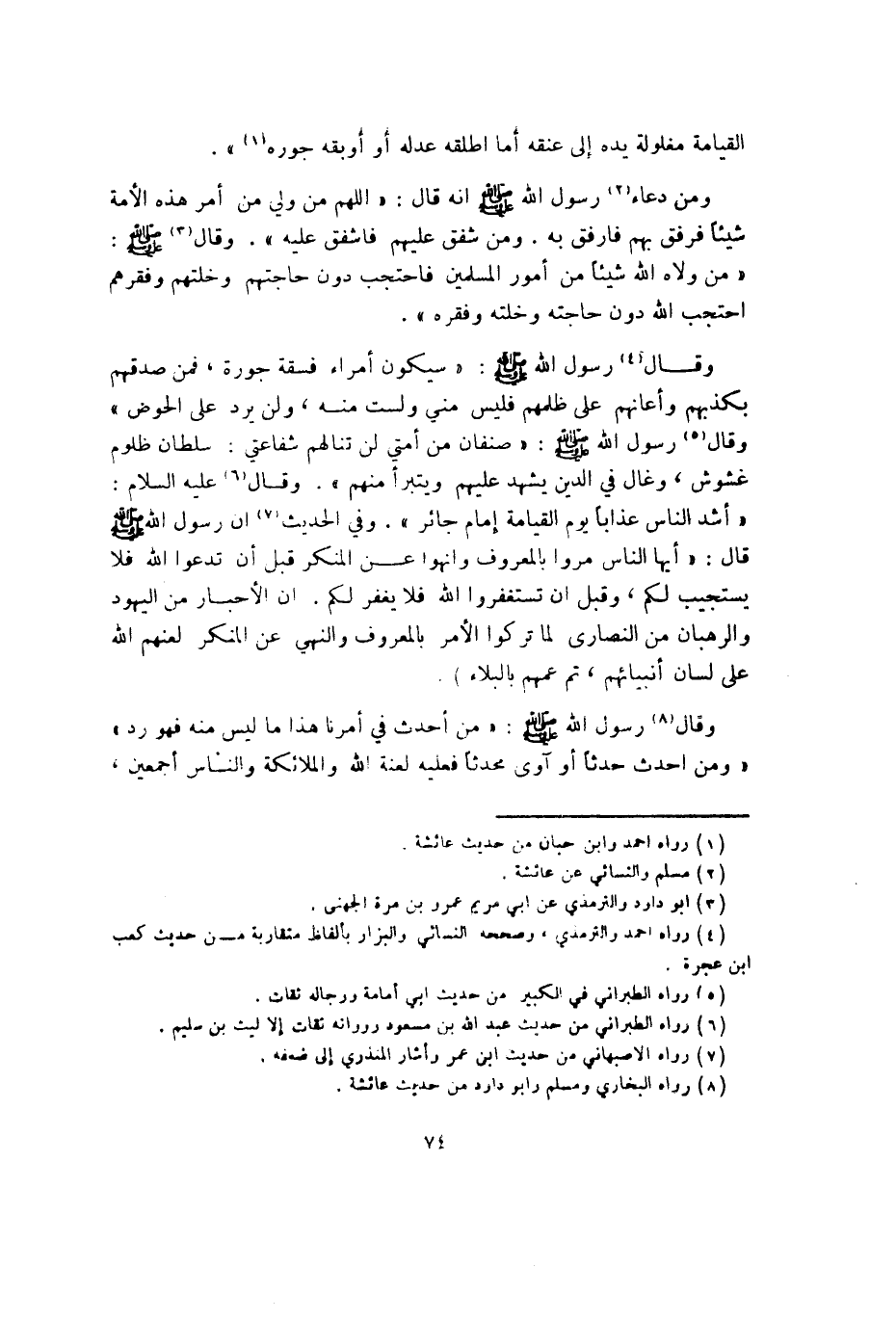 الْقِيَامَة مغلولة يَده إِلَى عُنُقه إِمَّا أطلقهُ عدله أَو أوبقه جوره وَمن دُعَاء رَسُول الله صلى الله عَلَيْهِ وَسلم أَنه قَالَ اللَّهُمَّ من ولي من أَمر هَذِه الْأمة شَيْئا فرفق بهم فارفق بِهِ وَمن شفق عَلَيْهِم فأشفق عَلَيْهِ وَقَالَ صلى الله عَلَيْهِ وَسلم من ولاه الله شَيْئا من أُمُور الْمُسلمين فاحتجب دون حَاجتهم وخلتهم وفقرهم احتجب الله دون حَاجته وَخلته وَفَقره وَقَالَ رَسُول الله صلى الله عَلَيْهِ وَسلم سَيكون أُمَرَاء فسقة جورة فَمن صدقهم بكذبهم وَأَعَانَهُمْ على ظلمهم فَلَيْسَ مني وَلست مِنْهُ وَلنْ يرد علي الْحَوْض وَقَالَ رَسُول الله صلى الله عَلَيْهِ وَسلم صنفان من أمتِي لن تنالهم شَفَاعَتِي سُلْطَان ظلوم غشوش وغال فِي الدين يشْهد عَلَيْهِم ويتبرأ مِنْهُم وَقَالَ عَلَيْهِ السَّلَام أَشد النَّاس عذَابا يَوْم الْقِيَامَة إِمَام جَائِر وَفِي الحَدِيث أَن رَسُول الله صلى الله عَلَيْهِ وَسلم قَالَ أَيهَا النَّاس مروا بِالْمَعْرُوفِ وانهوا عَن الْمُنكر قبل أَن تدعوا الله فَلَا يستجيب لكم وَقبل أَن تستغفروا الله فَلَا يغْفر لكم إِن الْأَحْبَار من الْيَهُود والرهبان من النَّصَارَى لما تركُوا الْأَمر بِالْمَعْرُوفِ وَالنَّهْي عَن الْمُنكر لعنهم الله على لِسَان أَنْبِيَائهمْ ثمَّ عمهم بالبلاء) وَقَالَ رَسُول الله صلى الله عَلَيْهِ وَسلم من أحدث فِي أمرنَا هَذَا مَا لَيْسَ مِنْهُ فَهُوَ رد وَمن أحدث حَدثا أَو آوى محدثنا فَعَلَيهِ لعنة الله وَالْمَلَائِكَة وَالنَّاس أَجْمَعِينَ