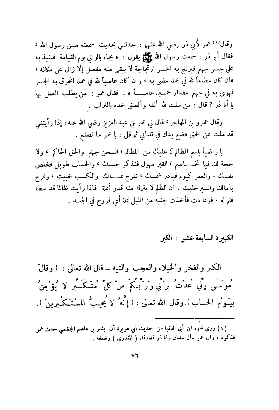 وَقَالَ عمر لأبي ذَر رَضِي الله عَنْهُمَا حَدثنِي بِحَدِيث سمعته من رَسُول الله فَقَالَ أَبُو ذَر سَمِعت رَسُول الله صلى الله عَلَيْهِ وَسلم يَقُول يجاء بالوالي يَوْم الْقِيَامَة فينبذ بِهِ على جسر جَهَنَّم فيرتج بِهِ الجسر ارتجاجة لَا يبْقى مِنْهُ مفصل إِلَّا زَالَ عَن مَكَانَهُ فَإِن كَانَ مُطيعًا لله فِي عمله مضى بِهِ وَإِن كَانَ عَاصِيا لله فِي عمله انخرق بِهِ الجسر فهوى بِهِ فِي جَهَنَّم مِقْدَار خمسين عَاما فَقَالَ عمر من يطْلب الْعَمَل بهَا يَا أَبَا ذَر قَالَ من سلت الله أَنفه وألصق خَدّه بِالتُّرَابِ وَقَالَ عَمْرو بن المُهَاجر قَالَ لي عمر بن عبد الْعَزِيز رَضِي الله عَنهُ إِذا رَأَيْتنِي قد ملت عَن الْحق فضع يدك فِي تلبابي ثمَّ قل يَا عمر مَا تصنع يَا رَاضِيا باسم الظَّالِم كم عَلَيْك من الْمَظَالِم السجْن جَهَنَّم وَالْحق حَاكم وَلَا حجَّة لَك فِيمَا تخاصم الْقَبْر مهول فَتذكر حَبسك والحساب طَوِيل فخلص نَفسك والعمر كَيَوْم فبادر شمسك تفرح بِمَالك وَالْكَسْب خَبِيث وتمرح بآمالك وَالسير حثيث إِن الظُّلم لَا يتْرك مِنْهُ قدر أُنْمُلَة فَإِذا رَأَيْت ظَالِما قد سَطَا فنم لَهُ فَرُبمَا بَات فَأخذت جنبه من اللَّيْل نملة أَي قُرُوح فِي الْجَسَد