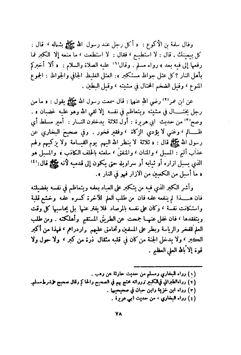 وَقَالَ سَلمَة بن الْأَكْوَع أكل رجل عِنْد رَسُول الله صلى الله عَلَيْهِ وَسلم بِشمَالِهِ قَالَ كل بيمينك قَالَ لَا أَسْتَطِيع فَقَالَ لَا اسْتَطَعْت مَا مَنعه إِلَّا الْكبر فَمَا رَفعهَا إِلَى فِيهِ بعد رَوَاهُ مُسلم وَقَالَ عَلَيْهِ الصَّلَاة وَالسَّلَام أَلا أخْبركُم بِأَهْل النَّار كل عتل جواظ مستكبر العتل الغليظ الجافي والجواظ الجموع المنوع وَقيل الضخم المختال فِي مشيته وَقيل البطين عَن ابْن عمر رَضِي الله عَنْهُمَا قَالَ سَمِعت رَسُول الله صلى الله عَلَيْهِ وَسلم يَقُول مَا من رجل يختال فِي مشيته ويتعاظم فِي نَفسه إِلَّا لَقِي الله وَهُوَ عَلَيْهِ غَضْبَان وَصَحَّ من حَدِيث أبي هُرَيْرَة أول ثَلَاثَة يدْخلُونَ النَّار أَمِير مسلط أَي ظَالِم وغني لَا يُؤَدِّي الزَّكَاة وفقير فخور وَفِي صَحِيح البُخَارِيّ عَن رَسُول الله صلى الله عَلَيْهِ وَسلم قَالَ ثَلَاثَة لَا ينظر الله إِلَيْهِم يَوْم الْقِيَامَة وَلَا يزكيهم وَلَهُم عَذَاب أَلِيم المسبل والمنان والمنفق سلْعَته بِالْحلف الْكَاذِب والمسبل هُوَ الَّذِي يسبل إزَاره أَو ثِيَابه أَو سراويله حَتَّى يكون إِلَى قَدَمَيْهِ لِأَنَّهُ صلى الله عَلَيْهِ وَسلم قَالَ مَا أسبل من الْكَعْبَيْنِ من الْإِزَار فَهُوَ فِي النَّار وأشر الْكبر الَّذِي فِيهِ من يتكبر على الْعباد بِعِلْمِهِ ويتعاظم فِي نَفسه بفضيلته فَإِن هَذَا لم يَنْفَعهُ علمه فَإِن من طلب الْعلم للآخرة كَسره علمه وخشع قلبه واستكانت نَفسه وَكَانَ على نَفسه بالمرصاد فَلَا يفتر عَنْهَا بل يحاسبها كل وَقت ويتفقدها فَإِن غفل عَنْهَا جمحت عَن الطَّرِيق الْمُسْتَقيم وأهلكته وَمن طلب الْعلم للفخر والرياسة وبطر على الْمُسلمين وتحامق عَلَيْهِم وازدراهم فَهَذَا من أكبر الْكبر وَلَا يدْخل الْجنَّة من كَانَ فِي قلبه مِثْقَال ذرة من كبر وَلَا حول وَلَا قُوَّة إِلَّا بِاللَّه الْعلي الْعَظِيم