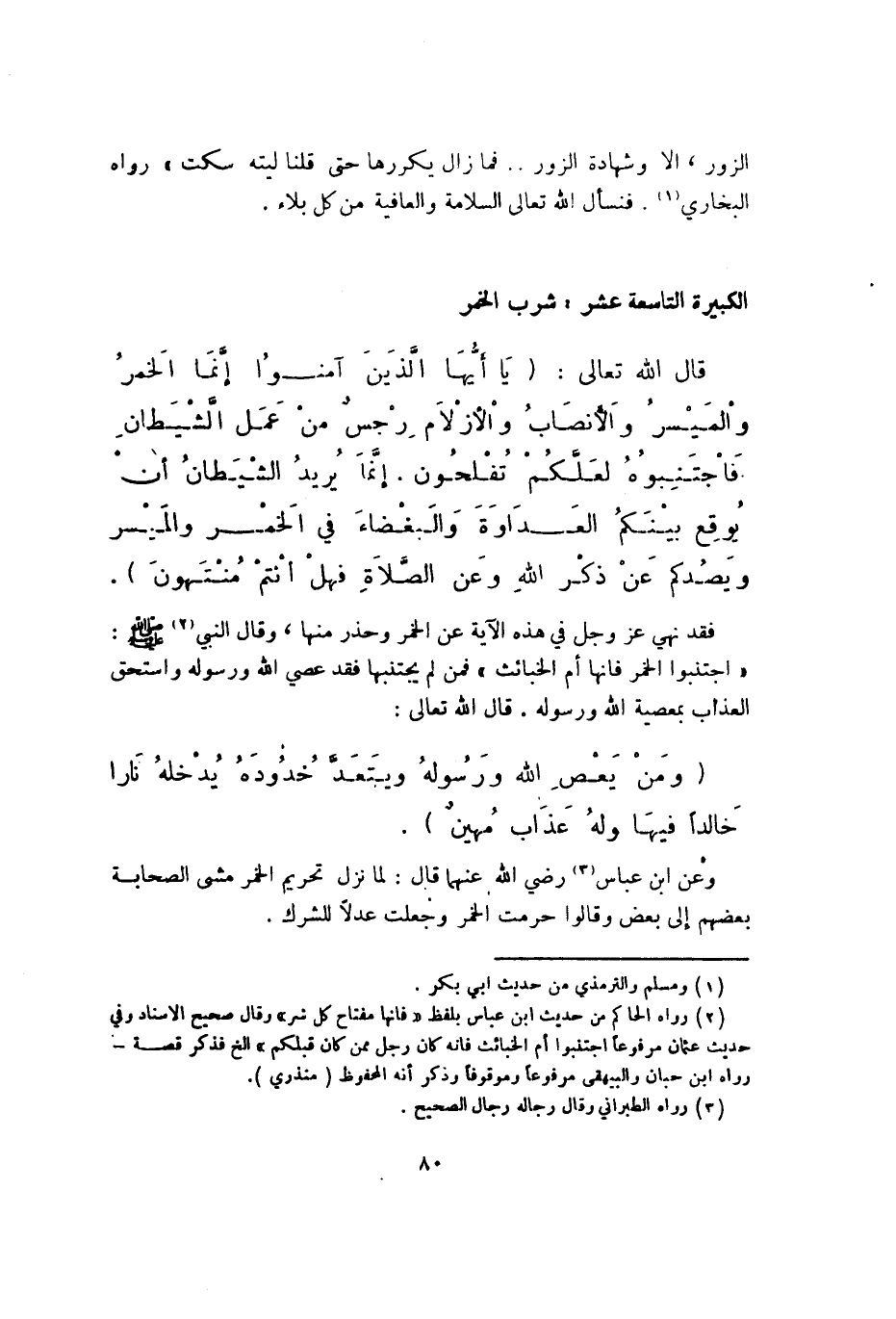 قَالَ الله تَعَالَى {يَا أَيهَا الَّذين آمنُوا إِنَّمَا الْخمر وَالْميسر والأنصاب والأزلام رِجْس من عمل الشَّيْطَان فَاجْتَنبُوهُ لَعَلَّكُمْ تفلحون إِنَّمَا يُرِيد الشَّيْطَان أَن يُوقع بَيْنكُم الْعَدَاوَة والبغضاء فِي الْخمر وَالْميسر ويصدكم عَن ذكر الله وَعَن الصَّلَاة فَهَل أَنْتُم مُنْتَهُونَ} فقد نهى عز وَجل فِي هَذِه الْآيَة عَن الْخمر وحذر مِنْهَا وَقَالَ النَّبِي صلى الله عَلَيْهِ وَسلم اجتنبوا الْخمر فَإِنَّهَا أم الْخَبَائِث فَمن لم يجتنبها فقد عصى الله وَرَسُوله وَاسْتحق الْعَذَاب بِمَعْصِيَة الله وَرَسُوله قَالَ الله تَعَالَى {وَمن يعْص الله وَرَسُوله ويتعد حُدُوده يدْخلهُ نَارا خَالِدا فِيهَا وَله عَذَاب مهين} وَعَن ابْن عَبَّاس رَضِي الله عَنْهُمَا قَالَ لما نزل تَحْرِيم الْخمر مَشى الصَّحَابَة بَعضهم إِلَى بعض وَقَالُوا حرمت الْخمر وَجعلت عدلاً للشرك