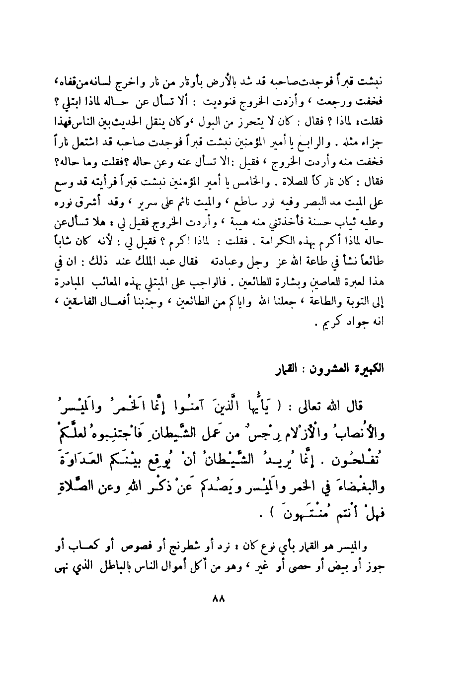 نبشت قبراً فَوجدت صَاحبه قد شد بِالْأَرْضِ بأوتار من نَار وَأخرج لِسَانه من قَفاهُ فَخفت وَرجعت وَأَرَدْت الْخُرُوج فنوديت أَلا تسْأَل عَن حَاله لماذا ابْتُلِيَ فَقلت لماذا فَقَالَ كَانَ لَا يتحرز من الْبَوْل وَكَانَ ينْقل الحَدِيث بَين النَّاس فَهَذَا جَزَاء مثله وَالرَّابِع يَا أَمِير الْمُؤمنِينَ نبشت قبراً فَوجدت صَاحبه قد اشتعل نَارا فَخفت مِنْهُ وَأَرَدْت الْخُرُوج فَقيل أَلا تسْأَل عَنهُ وَعَن حَاله فَقلت وَمَا حَاله فَقَالَ كَانَ تَارِكًا للصَّلَاة وَالْخَامِس يَا أَمِير الْمُؤمنِينَ نبشت قبراً فرأيته قد وسع على الْمَيِّت مد الْبَصَر وَفِيه نور سَاطِع وَالْمَيِّت نَائِم على سَرِير وَقد أشرق نوره وَعَلِيهِ ثِيَاب حَسَنَة فَأَخَذَتْنِي مِنْهُ هَيْبَة وَأَرَدْت الْخُرُوج فَقيل لي هلا تسْأَل عَن حَاله لماذا أكْرم بِهَذَا الْكَرَامَة فَقلت لماذا أكْرم فَقيل لي لِأَنَّهُ كَانَ شَابًّا طَائِعا نَشأ فِي طَاعَة الله عز وَجل وعبادته فَقَالَ عبد الْملك عِنْد ذَلِك إِن فِي هَذَا لعبرة للعاصين وَبشَارَة للطائعين فَالْوَاجِب على المبتلى بِهَذِهِ المعائب الْمُبَادرَة إِلَى التَّوْبَة وَالطَّاعَة جعلنَا الله وَإِيَّاكُم من الطائعين وجنبنا أَفعَال الْفَاسِقين إِنَّه جواد كريم