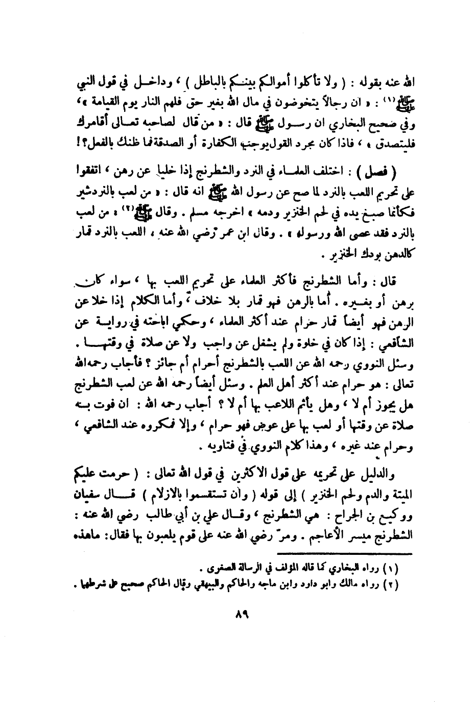 اخْتلف الْعلمَاء فِي النَّرْد وَالشطْرَنْج إِذا خلياً عَن رهن اتَّفقُوا على تَحْرِيم اللعب بالنرد لما صَحَّ عَن رَسُول الله صلى الله عَلَيْهِ وَسلم أَنه قَالَ من لعب بالنرد شير فَكَأَنَّمَا صبغ يَده فِي لحم الْخِنْزِير وَدَمه أخرجه مُسلم وَقَالَ صلى الله عَلَيْهِ وَسلم من لعب بالنرد فقد عصى الله وَرَسُوله وَقَالَ ابْن عمر رَضِي الله عَنهُ اللعب بالنرد قمار كالدهن بودك الْخِنْزِير قَالَ وَأما الشطرنج فَأكْثر الْعلمَاء على تَحْرِيم اللعب بهَا سَوَاء كَانَ برهن أَو بِغَيْرِهِ أما بِالرَّهْنِ فَهُوَ قمار بِلَا خلاف وَأما الْكَلَام إِذا خلا عَن الرَّهْن فَهُوَ أَيْضا قمار حرَام عِنْد أَكثر الْعلمَاء وَحكي إِبَاحَته فِي رِوَايَة عَن الشَّافِعِي إِذا كَانَ فِي خلْوَة وَلم يشغل عَن وَاجِب وَلَا عَن صَلَاة فِي وَقتهَا وَسُئِلَ النَّوَوِيّ رَحمَه الله عَن اللعب بالشطرنج أحرام أم جَائِز فَأجَاب رَحمَه الله تَعَالَى هُوَ حرَام عِنْد أَكثر أهل الْعلم وَسُئِلَ أَيْضا رَحمَه الله عَن لعب الشطرنج هَل يجوز أم لَا وَهل يَأْثَم اللاعب بهَا أم لَا أجَاب رَحمَه الله إِن فَوت بِهِ صَلَاة عَن وَقتهَا أَو لعب بهَا على عوض فَهُوَ حرَام وَإِلَّا فمكروه عِنْد الشَّافِعِي وَحرَام عِنْد غَيره وَهَذَا كَلَام النَّوَوِيّ فِي فَتَاوِيهِ وَالدَّلِيل على تَحْرِيمه على قَول الْأَكْثَرين فِي قَول الله تَعَالَى {حرمت عَلَيْكُم الْميتَة وَالدَّم وَلحم الْخِنْزِير} إِلَى قَوْله {وَأَن تستقسموا بالأزلام} قَالَ سُفْيَان ووكيع بن الْجراح هِيَ الشطرنج وَقَالَ عَليّ بن أبي طَالب رَضِي الله عَنهُ الشطرنج ميسر الْأَعَاجِم وَمر رَضِي الله عَنهُ على قوم يَلْعَبُونَ بهَا فَقَالَ مَا هَذِه