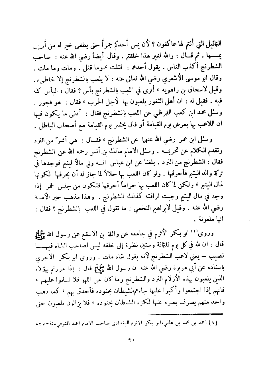 التماثيل الَّتِي أَنْتُم لَهَا عاكفون لِأَن يمس أحدكُم جمراً حَتَّى يطفى خير لَهُ من أَن يمسسها ثمَّ قَالَ وَالله لغير هَذَا خلقْتُمْ وَقَالَ أَيْضا رَضِي الله عَنهُ صَاحب الشطرنج أكذب النَّاس يَقُول أحدهم قتلت وَمَا قتل وَمَات وَمَا مَاتَ وَقَالَ أَبُو مُوسَى الْأَشْعَرِيّ رَضِي الله تَعَالَى عَنهُ لَا يلْعَب بالشطرنج إِلَّا خاطئ وَقيل لإسحاق بن رَاهْوَيْةِ أَتَرَى فِي اللعب بالشطرنج بَأْس فَقَالَ الْبَأْس كُله فِيهِ فَقيل لَهُ إِن أهل الثغور يَلْعَبُونَ بهَا لأجل الْحَرْب فَقَالَ هُوَ فجور وَسُئِلَ مُحَمَّد بن كَعْب الْقرظِيّ عَن اللعب بالشطرنج فَقَالَ أدنى مَا يكون فِيهَا أَن اللاعب بهَا يعرض يَوْم الْقِيَامَة أَو قَالَ يحْشر يَوْم الْقِيَامَة مَعَ أَصْحَاب الْبَاطِل وَسُئِلَ ابْن عمر رَضِي الله عَنْهُمَا عَن الشطرنج فَقَالَ هِيَ أشر من النَّرْد وَتقدم الْكَلَام عَن تَحْرِيمه وَسُئِلَ الإِمَام مَالك بن أنس رَحمَه الله عَن الشطرنج فَقَالَ الشطرنج من النَّرْد بلغنَا عَن ابْن عَبَّاس أَنه ولي مَالا ليتيم فَوَجَدَهَا فِي تَرِكَة وَالِد الْيَتِيم فأحرقها وَلَو كَانَ اللعب بهَا حَلَالا لما جَازَ لَهُ أَن يحرقها لكَونهَا مَال الْيَتِيم وَلَكِن لما كَانَ اللعب بهَا حَرَامًا أحرقها فَتكون من جنس الْخمر إِذا وجد فِي مَال الْيَتِيم وَجَبت إراقته كَذَلِك الشطرنج وَهَذَا مَذْهَب حبر الْأمة رَضِي الله عَنهُ وَقيل لإِبْرَاهِيم النَّخعِيّ مَا تَقول فِي اللعب بالشطرنج فَقَالَ إِنَّهَا ملعونة وروى أَبُو بكر الْأَثْرَم فِي جَامعه عَن وَاثِلَة بن الْأَسْقَع عَن رَسُول الله صلى الله عَلَيْهِ وَسلم قَالَ إِن لله فِي كل يَوْم ثلثمِائة وَسِتِّينَ نظرة إِلَى خلقه لَيْسَ لصَاحب الشاه فِيهَا نصيب يَعْنِي لاعب الشطرنج لِأَنَّهُ يَقُول شاه مَاتَ وروى أَبُو بكر الأجري بإسناده عَن أبي هُرَيْرَة رَضِي الله عَنهُ أَن رَسُول الله صلى الله عَلَيْهِ وَسلم قَالَ إِذا مررتم بهؤلاء الَّذين يَلْعَبُونَ بِهَذِهِ الأزلام النَّرْد وَالشطْرَنْج وَمَا كَانَ من اللَّهْو فَلَا تسلموا عَلَيْهِم فَإِنَّهُم إِذا اجْتَمعُوا وأكبوا عَلَيْهَا جَاءَهُم الشَّيْطَان بجُنُوده فأحدق بهم كلما ذهب وَاحِد مِنْهُم يصرف بَصَره عَنْهَا لكزه الشَّيْطَان بجُنُوده فَلَا يزالون يَلْعَبُونَ حَتَّى