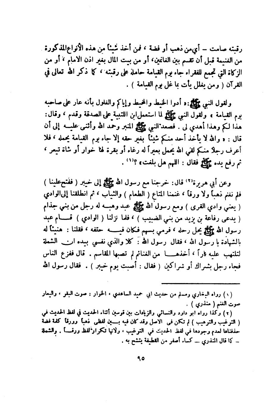 رقبته صَامت أَي من ذهب أَو فضَّة فَمن أَخذ شَيْئا من هَذِه الْأَنْوَاع الْمَذْكُورَة من الْغَنِيمَة قبل أَن تقسم بَين الْغَانِمين أَو من بَيت المَال بِغَيْر إِذن الإِمَام أَو من الزَّكَاة الَّتِي تجمع للْفُقَرَاء جَاءَ يَوْم الْقِيَامَة حامله على رقبته كَمَا ذكر الله تَعَالَى فِي الْقُرْآن {وَمن يغلل يَأْتِ بِمَا غل يَوْم الْقِيَامَة} وَلقَوْل النَّبِي صلى الله عَلَيْهِ وَسلم أَدّوا الْخَيط والمخيط وَإِيَّاكُم والغلول بِأَنَّهُ عَار على صَاحبه يَوْم الْقِيَامَة وَلقَوْل النَّبِي صلى الله عَلَيْهِ وَسلم لما اسْتعْمل ابْن اللتبية على الصَّدَقَة وَقدم وَقَالَ هَذَا لكم وَهَذَا أهدي لي فَصَعدَ النَّبِي صلى الله عَلَيْهِ وَسلم الْمِنْبَر وَحمد الله وَأثْنى عَلَيْهِ إِلَى أَن قَالَ وَالله لَا يَأْخُذ أحد مِنْكُم شَيْئا بِغَيْر حَقه إِلَّا جَاءَ يَوْم الْقِيَامَة يحملهُ فَلَا أعرف رجلاً مِنْكُم لَقِي الله يحمل بَعِيرًا لَهُ رُغَاء أَو بقرة لَهَا خوار أَو شَاة تَيْعر ثمَّ رفع يَده صلى الله عَلَيْهِ وَسلم فَقَالَ اللَّهُمَّ هَل بلغت وَعَن أبي هُرَيْرَة قَالَ خرجنَا مَعَ رَسُول الله صلى الله عَلَيْهِ وَسلم إِلَى خَيْبَر (فَفتح علينا) فَلم نغنم ذَهَبا وَلَا وَرقا غنمناً الْمَتَاع (الطَّعَام) وَالثيَاب ثمَّ انطلقنا إِلَى الْوَادي (يَعْنِي وَادي الْقرى) وَمَعَ رَسُول الله صلى الله عَلَيْهِ وَسلم عبد وهبه لَهُ رجل من بني جذام (يدعى رِفَاعَة بن يزِيد من بني الضبيب) فَلَمَّا نزل (الْوَادي) قَامَ عبد رَسُول الله صلى الله عَلَيْهِ وَسلم يحل رَحْله فَرمي بِسَهْم فَكَانَ فِيهِ حتفه فَقُلْنَا هَنِيئًا لَهُ بِالشَّهَادَةِ يَا رَسُول الله فَقَالَ رَسُول الله كلا وَالَّذِي نَفسِي بِيَدِهِ إِن الشملة لتلتهب عَلَيْهِ نَارا أَخذهَا من الْغَنَائِم لم تصبها المقاسم قَالَ فَفَزعَ النَّاس فجَاء رجل بِشِرَاك أَو شراكين (فَقَالَ أصبت يَوْم خَيْبَر) فَقَالَ رَسُول الله