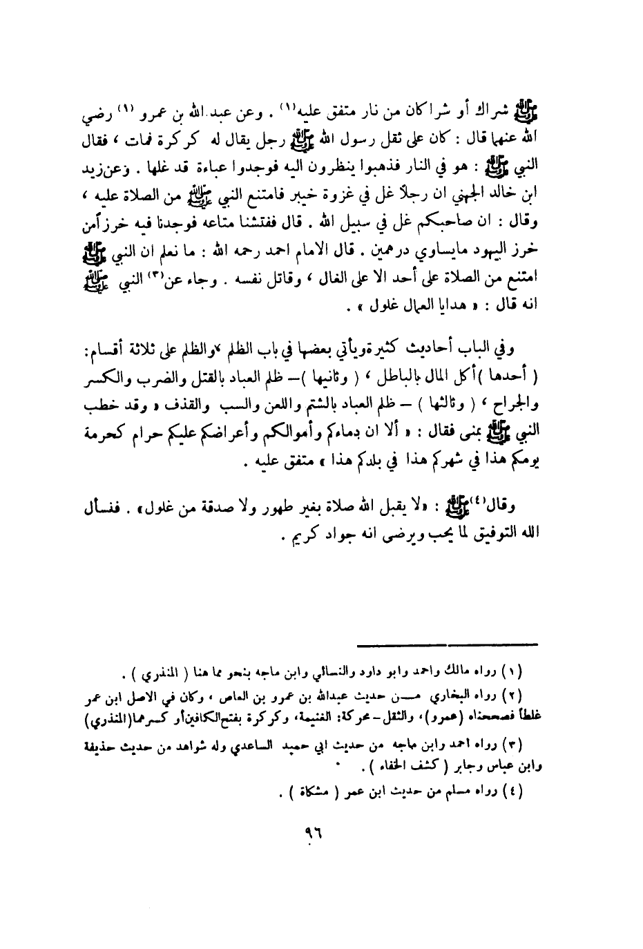صلى الله عَلَيْهِ وَسلم شِرَاك أَو شراكان من نَار مُتَّفق عَلَيْهِ وَعَن عبد الله بن عَمْرو رَضِي الله عَنْهُمَا قَالَ كَانَ على ثقل رَسُول الله صلى الله عَلَيْهِ وَسلم رجل يُقَال لَهُ كركرة فَمَاتَ فَقَالَ النَّبِي صلى الله عَلَيْهِ وَسلم هُوَ فِي النَّار فَذَهَبُوا ينظرُونَ إِلَيْهِ فوجدوا عباءة قد غلها وَعَن زيد بن خَالِد الْجُهَنِيّ أَن رجلاً غل فِي غَزْوَة خَيْبَر فَامْتنعَ النَّبِي صلى الله عَلَيْهِ وَسلم من الصَّلَاة عَلَيْهِ وَقَالَ إِن صَاحبكُم غل فِي سَبِيل الله قَالَ ففتشنا مَتَاعه فَوَجَدنَا فِيهِ خرزاً من خرز الْيَهُود مَا يُسَاوِي دِرْهَمَيْنِ قَالَ الإِمَام أَحْمد رَحمَه الله مَا نعلم أَن النَّبِي صلى الله عَلَيْهِ وَسلم امْتنع من الصَّلَاة على أحد إِلَّا على الغال وَقَاتل نَفسه وَجَاء عَن النَّبِي صلى الله عَلَيْهِ وَسلم أَنه قَالَ هَدَايَا الْعمَّال غلُول وَفِي الْبَاب أَحَادِيث كَثِيرَة وَيَأْتِي بَعْضهَا فِي بَاب الظُّلم وَالظُّلم على ثَلَاثَة أَقسَام (أَحدهَا) أكل المَال بِالْبَاطِلِ (وَثَانِيها) ظلم الْعباد بِالْقَتْلِ وَالضَّرْب وَالْكَسْر والجراح (وَثَالِثهَا) ظلم الْعباد بالشتم واللعن والسب وَالْقَذْف وَقد خطب النَّبِي صلى الله عَلَيْهِ وَسلم بمنى فَقَالَ أَلا إِن دماءكم وَأَمْوَالكُمْ وَأَعْرَاضكُمْ عَلَيْكُم حرَام كَحُرْمَةِ يومكم هَذَا فِي شهركم هَذَا فِي بلدكم هَذَا مُتَّفق عَلَيْهِ وَقَالَ صلى الله عَلَيْهِ وَسلم لَا يقبل الله صَلَاة بِغَيْر طهُور وَلَا صَدَقَة من غلُول فنسأل الله التَّوْفِيق لما يحب ويرضى إِنَّه جواد كريم