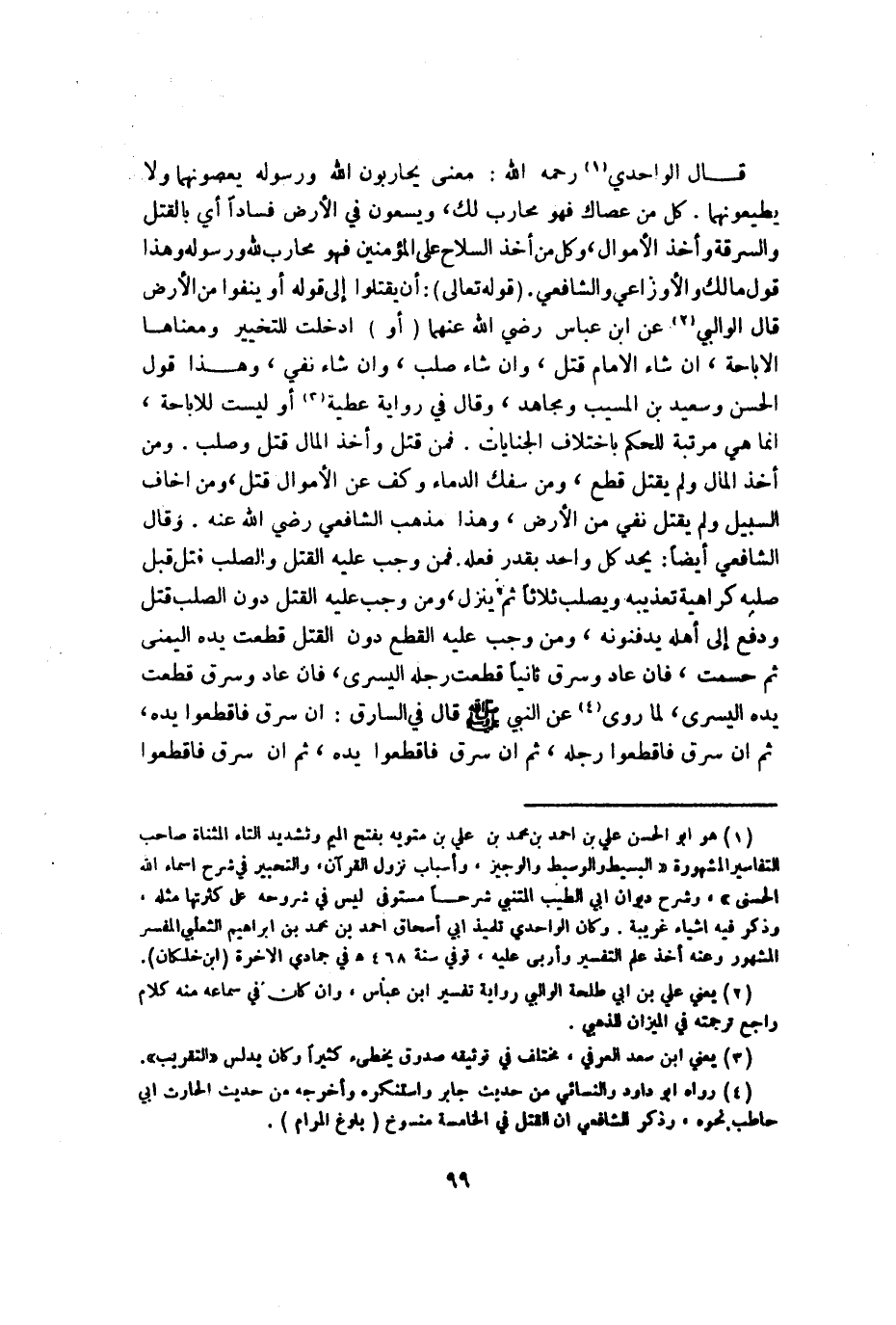 قَالَ الواحدي رَحمَه الله معنى يُحَاربُونَ الله وَرَسُوله يعصونهما وَلَا يطيعونهما كل من عصاك فَهُوَ محَارب لَك ويسعون فِي الأَرْض فَسَادًا أَي بِالْقَتْلِ وَالسَّرِقَة وَأخذ الْأَمْوَال وكل من أَخذ السِّلَاح على الْمُؤمنِينَ فَهُوَ محَارب لله وَرَسُوله وَهَذَا قَول مَالك وَالْأَوْزَاعِيّ وَالشَّافِعِيّ (قَوْله تَعَالَى) أَن يقتلُوا إِلَى قَوْله أَو ينفوا من الأَرْض قَالَ الْوَالِبِي عَن ابْن عَبَّاس رَضِي الله عَنْهُمَا (أَو) أدخلت للتَّخْيِير وَمَعْنَاهَا الْإِبَاحَة إِن شَاءَ الإِمَام قتل وَإِن شَاءَ صلب وَإِن شَاءَ نفي وَهَذَا قَول الْحسن وَسَعِيد بن الْمسيب وَمُجاهد وَقَالَ فِي رِوَايَة عَطِيَّة أَو لَيست للْإِبَاحَة إِنَّمَا هِيَ مرتبَة للْحكم باخْتلَاف الْجِنَايَات فَمن قتل وَأخذ المَال قتل وصلب وَمن أَخذ المَال وَلم يقتل قطع وَمن سفك الدِّمَاء وكف عَن الْأَمْوَال قتل وَمن أَخَاف السَّبِيل وَلم يقتل نفي من الأَرْض وَهَذَا مَذْهَب الشَّافِعِي رَضِي الله عَنهُ وَقَالَ الشَّافِعِي أَيْضا يحد كل وَاحِد بِقدر فعله فَمن وَجب عَلَيْهِ الْقَتْل والصلب قتل قبل صلبه كَرَاهِيَة تعذيبه ويصلب ثَلَاثًا ثمَّ ينزل وَمن وَجب عَلَيْهِ الْقَتْل دون الصلب قتل وَدفع إِلَى أَهله يدفنونه وَمن وَجب عَلَيْهِ الْقطع دون الْقَتْل قطعت يَده الْيُمْنَى ثمَّ حسمت فَإِن عَاد وسرق ثَانِيًا قطعت رجله الْيُسْرَى فَإِن عَاد وسرق قطعت يَده الْيُسْرَى لما رُوِيَ عَن النَّبِي صلى الله عَلَيْهِ وَسلم قَالَ فِي السَّارِق إِن سرق فَاقْطَعُوا يَده ثمَّ إِن سرق فَاقْطَعُوا رجله ثمَّ إِن سرق فَاقْطَعُوا يَده ثمَّ إِن سرق فَاقْطَعُوا