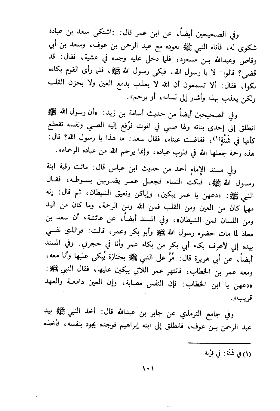 وفي مسند الامام أحمد من حديث بن عباس قال ماتت رقية ابنة رسول الله فبكت النساء فجعل عمر يضربهن بسوطه فقال النبي: "دعهن يا عمر يبكين وإياكن ونعيق الشيطان ثم قال انه مهما كان من العين ومن القلب فمن الله ومن الرحمة وما كان من اليد ومن اللسان فمن الشيطان " وفي المسند أيضا عن عائشة أن سعد بن معاذ لما مات حضره رسول الله وأبو بكر وعمر قالت فوالذى نفسى بيده انى لأعرف بكاء أبى بكر من بكاء عمر وأنا في حجرتى وفي المسند أيضا عن أبى هريرة قال مر على النبي بجنازة يبكى عليها وأنا معه ومعه عمر بن الخطاب فانتهر عمر اللاتى يبكين عليها فقال النبي: "دعهن يا ابن الخطاب فان النفس مصابة وان العين دامعة والعهد قريب".