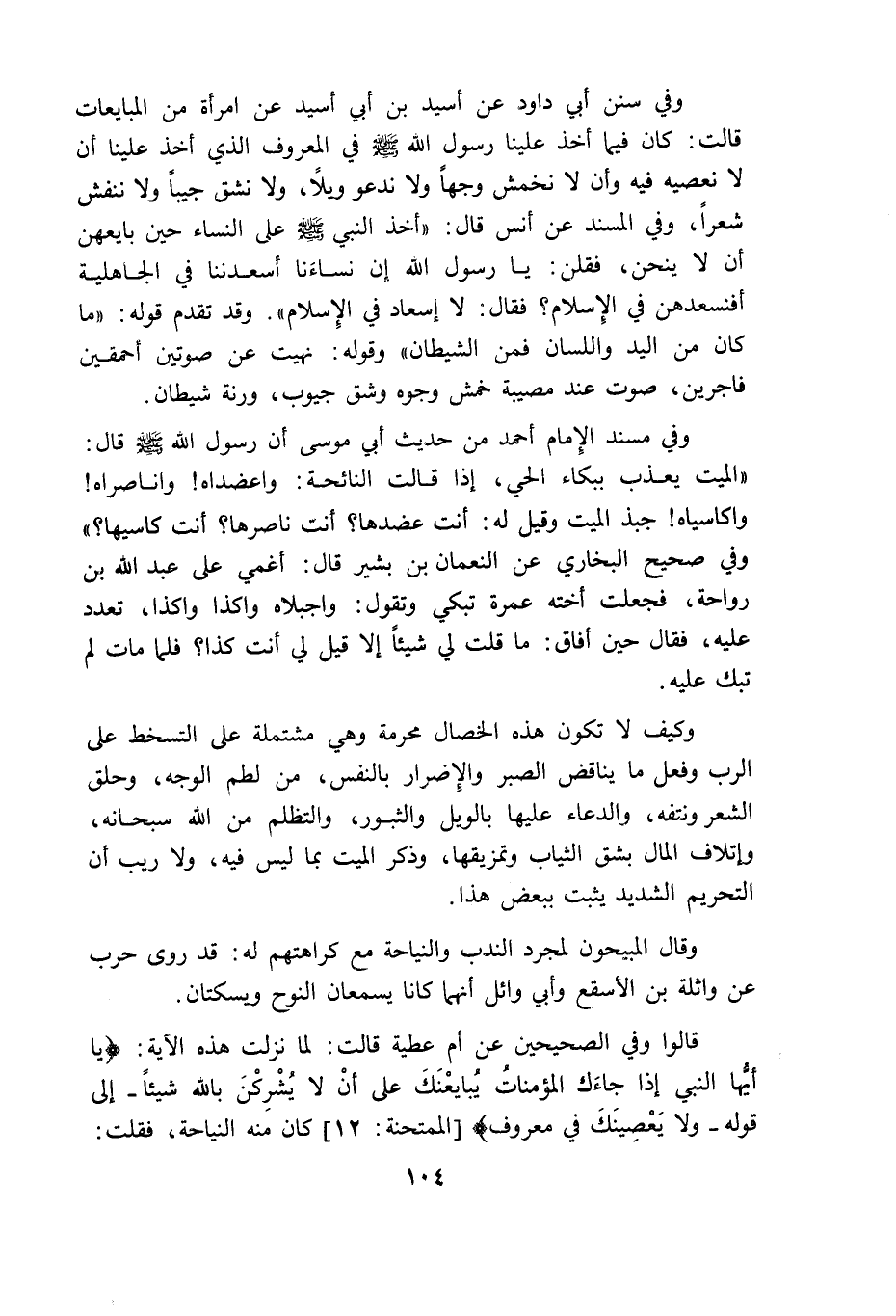 وفي سنن ابى داود عن أسيد بن أبي أسيد عن امرأة من المبايعات قالت كان فيما أخذ علينا رسول الله في المعروف الذى أخذ علينا أن لا نعصيه فيه أن لا نخمش وجها ولا ندعو ويلا ولا نشق جيبا ولا ننفش شعرا وفي المسند عن انس قال: "أخذ النبي على النساء حين بايعهن أن لا ينحن فقلن يا رسول الله ان نساء أسعدتنا في الجاهلية أفنسعدهن في الاسلام فقال لا إسعاد في الاسلام" وقد تقدم قوله: "ما كان من اليد واللسان فمن الشيطان " وقوله "نهيت عن صوتين أحمقين فاجرين صوت عند مصيبة خمش وجوه وشق جيوب ورنة شيطان"