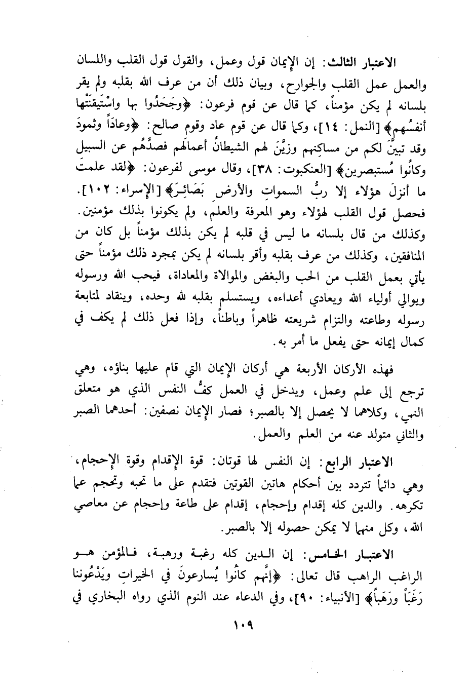 الاعتبار الثالث أن الايمان قول وعمل والقول قول القلب واللسان والعمل عمل القلب والجوارح وبيان ذلك أن من عرف الله بقلبه ولم يقر بلسانه لم يكن مؤمنا كما قال عن قوم فرعون {وجحدوا بها واستيقنتها أنفسهم} وكما قال عن قوم عاد وقوم صالح {وعادا وثمود وقد تبين لكم من مساكنهم وزين لهم الشيطان أعمالهم فصدهم عن السبيل وكانوا مستبصرين} وقال موسى لفرعون {لقد علمت ما أنزل هؤلاء الا رب السموات والارض بصائر} فهؤلاء حصل قول القلب وهو المعرفة والعلم ولم يكونوا بذلك مؤمنين وكذلك من قال بلسانه ما ليس في قلبه لم يكن بذلك مؤمنا بل كان من المنافقين وكذلك من عرف بقلبه وأقر بلسانه لم يكن بمجرد ذلك مؤمنا حتى يأتى بعمل القلب من الحب والبغض والموالاة والمعاداة فيحب الله ورسوله ويوالى أولياء الله ويعادى أعداءه ويستسلم بقلبه لله وحده وينقاد لمتابعة رسوله وطاعته والتزام شريعته ظاهرا وباطنا واذا فعل ذلك لم يكف في كمال ايمانه حتى يفعل ما امر به