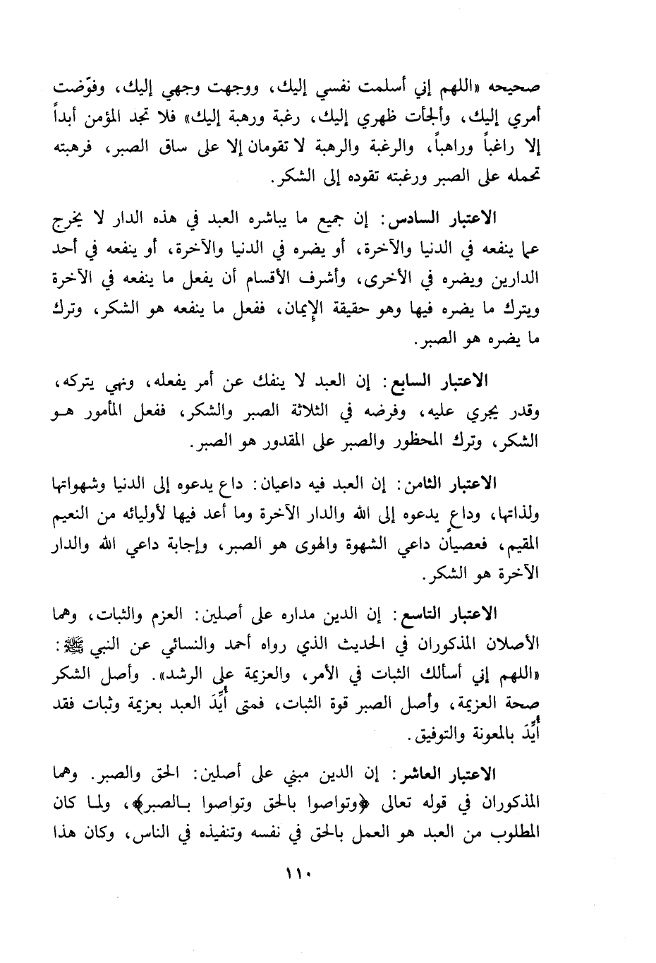 الاعتبار التاسع ان الدين مداره على أصلين العزم والثبات وهما الأصلان المذكوران في الحديث الذى رواه أحمد والنسائى عن النبي: "اللهم إنى أسألك الثبات في الأمر والعزيمة على الرشد" وأصل الشكر صحة العزيمة وأصل الصبر قوة الثبات فمتى أيد العبد بعزيمة وثبات فقد أيد بالمعونة والتوفيق