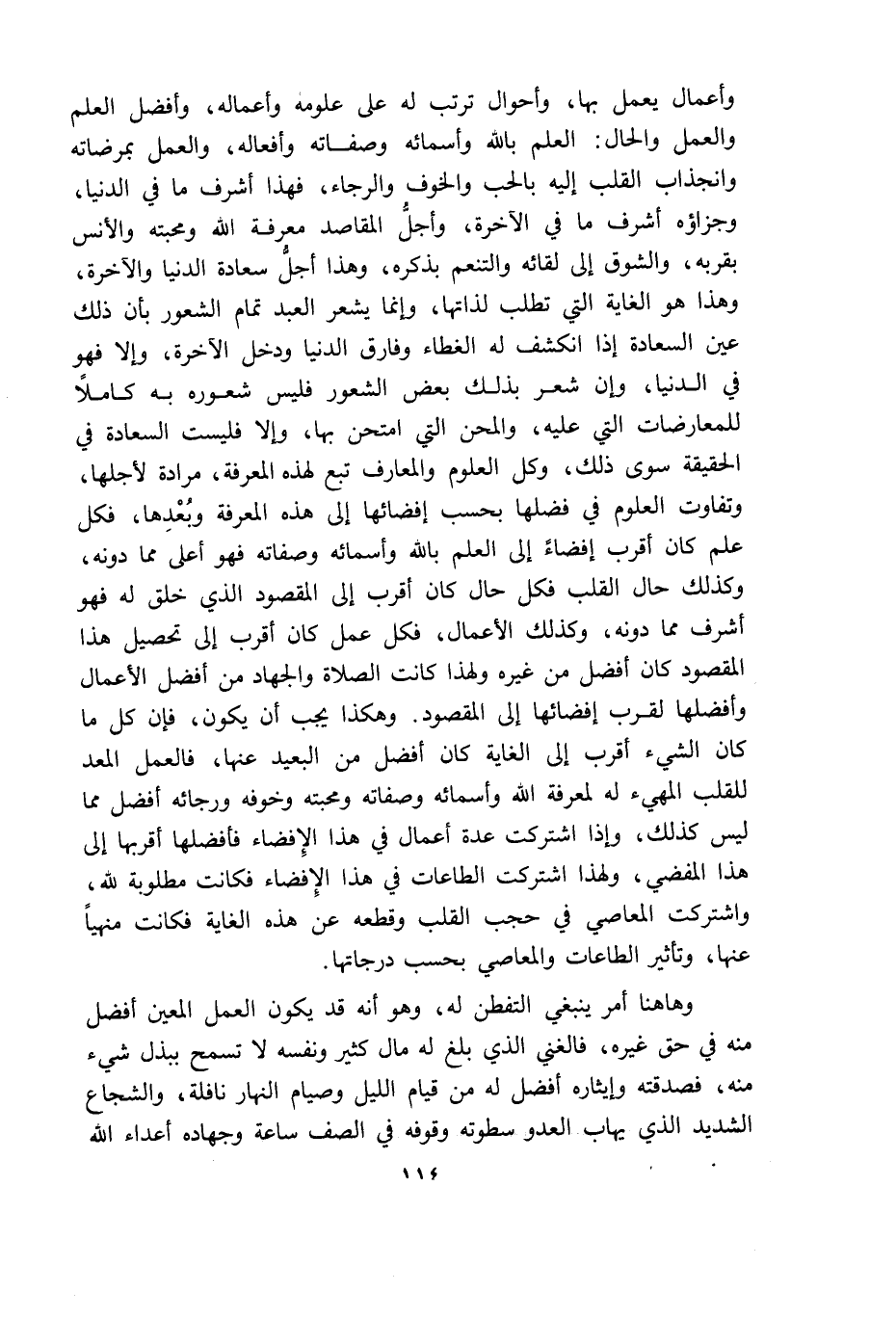 وأعمال يعمل بها وأحوال ترتب له على علومه وأعماله وأفضل العلم والعمل والحال العلم بالله وأسمائه وصفاته وأفعاله والعمل بمرضاته وانجذاب القلب إليه بالحب والخوف والرجاء فهذا أشرف ما في الدنيا وجزاؤه أشرف ما في الاخرة وأجل المقاصد معرفة الله ومحبته والأنس بقربه والشوق إلى لقائه والتنعم بذكره وهذا أجل سعادة الدنيا والآخرة وهذا هو الغاية التى تطلب لذاتها وانما يشعر العبد تمام الشعور بأن ذلك عين السعادة اذا انكشف له الغطاء وفارق الدنيا ودخل الاخرة والا فهو في الدنيا وان شعر بذلك بعض الشعور فليس شعوره به كاملا للمعارضات التى عليه والمحن التى امتحن بها والا فليست السعادة في الحقيقة سوى ذلك وكل العلوم والمعارف تبع لهذه المعرفة مرادة لأجلها وتفاوت العلوم في فضلها بحسب افضائها إلى هذه المعرفة وبعدها فكل علم كان أقرب افضاء إلى العلم بالله وأسمائه وصفاته فهو أعلى مما دونه وكذلك حال القلب فكل حال كان أقرب إلى المقصود الذى خلق له فهو أشرف مما دونه وكذلك الاعمال فكل عمل كان أقرب إلى تحصيل هذا المقصود كان أفضل من غيره ولهذا كانت الصلاة والجهاد من أفضل الأعمال وأفضلها لقرب افضائها إلى المقصود وهكذا يجب أن يكون فإن كل ما كان الشيء أقرب إلى الغاية كان أفضل من البعيد عنها فالعمل المعد للقلب المهيئ له لمعرفة الله وأسمائه وصفاته ومحبته وخوفه ورجائه أفضل مما ليس كذلك واذا أشتركت عدة أعمال في هذا الافضاء فأفضلها أقربها إلى هذا المفضى ولهذا اشتركت الطاعات في هذا الإفضاء فكانت مطلوبة لله واشتركت المعاصى في حجب القلب وقطعه عن هذه الغاية فكانت منهيا عنها وتأثير الطاعات والمعاصى بحسب درجاتها