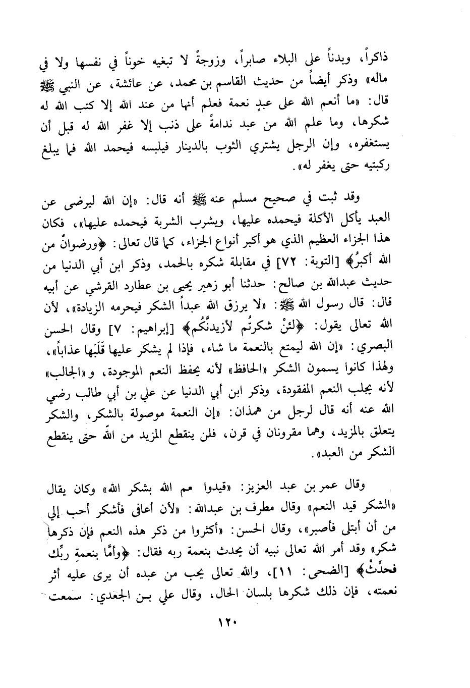 وقال عمر بن عبد العزيز قيدوا نعم الله بشكر الله وكان يقال الشكر قيد النعم وقال مطرف بن عبد الله "لأن أعافى فأشكر أحب إلى من أن ابتلى فأصبر" وقال الحسن "أكثروا من ذكر هذه النعم فإن ذكرها شكر" وقد أمر الله تعالى نبيه أن يحدث بنعمة ربه فقال وأما بنعمة ربك فحدث والله تعالى يحب من عبده أن يرى عليه أثر نعمته فإن ذلك شكرها بلسان الحال وقال على بن الجعدى سمعت